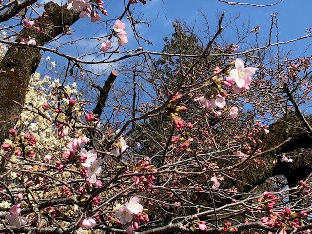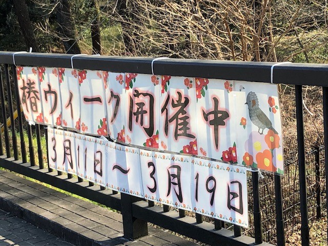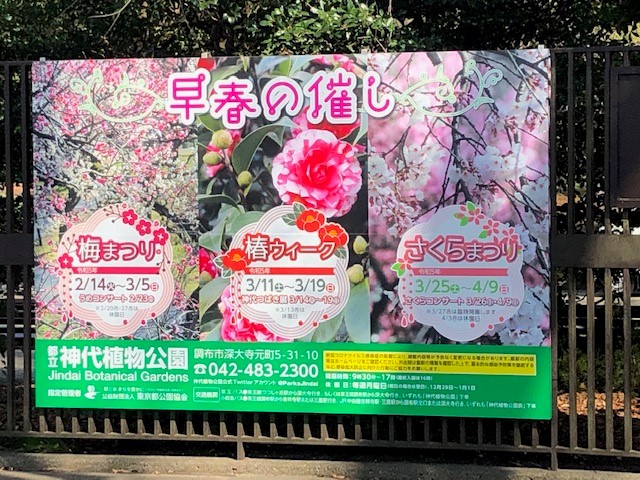 3月の良く晴れた平日の午後、調布駅からバスに乗って神代植物公園へ行ってみました。入り口には、梅まつり、椿ウイーク、さくらまつりの案内のボードがあります。入場料は500円。チケットを購入して中に入りましょう。