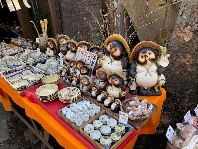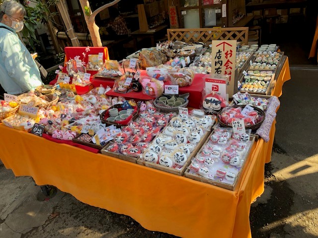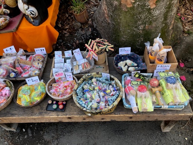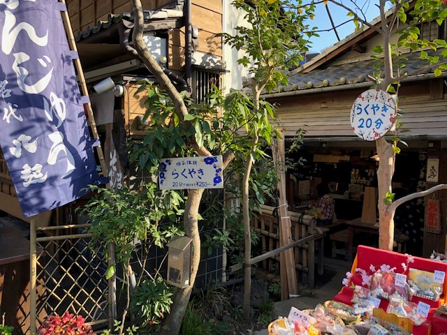 また、門前にはたくさんの面白いお店がありました。らくやきの体験があったり、タヌキの置物やビー玉などのなつかしい玩具も売られていて、心惹かれます。