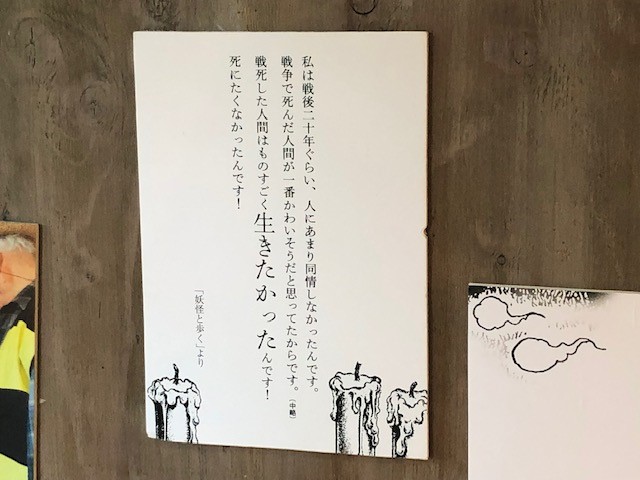 壁に貼られた展示には、水木先生の戦争は嫌だという心の底からの強いメッセージが感じられます。今こそ大切に、心にとめなければと思いつつ、店をあとにしました。