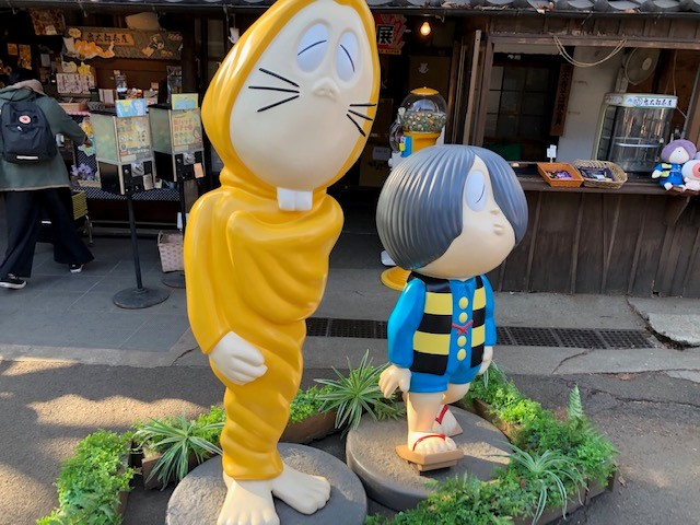 咲き始めの桜を眺めつつ歩くと、ねずみ男と鬼太郎が!