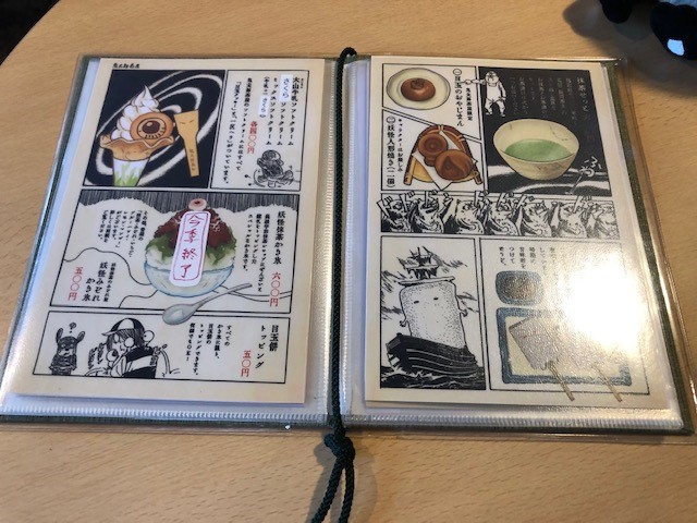 テーブルの上にあるリアルな目玉のおやじを眺めながら、漫画仕立てのメニューを見ているだけで楽しい!