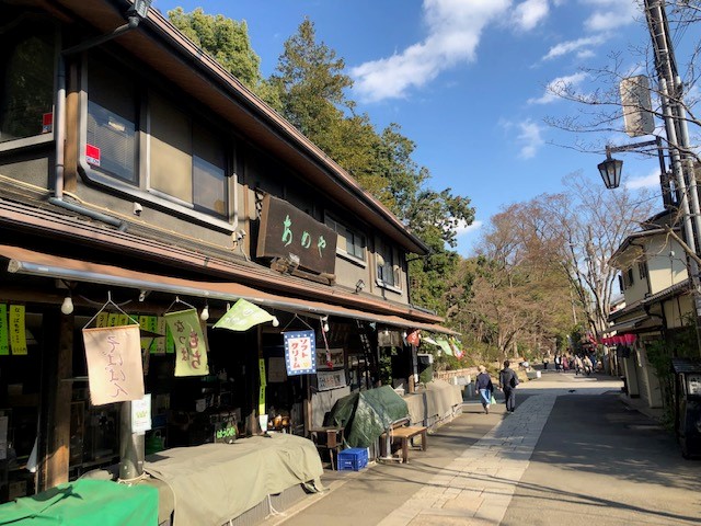 さて、神代植物公園の深大寺門を出て、少し歩いていくと風情ある門前の風景が広がります。名物のお蕎麦屋さんもたくさん。