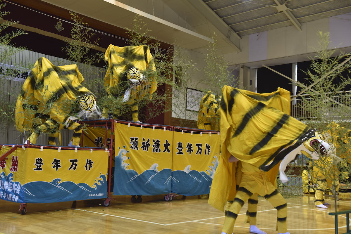 その次は、虎が5匹も登場する「山田境田虎舞」の演舞!虎の威を借りて海難をもたらす風を鎮め、海上安全、大漁満作、家内安全などを祈願する意味が込められている。