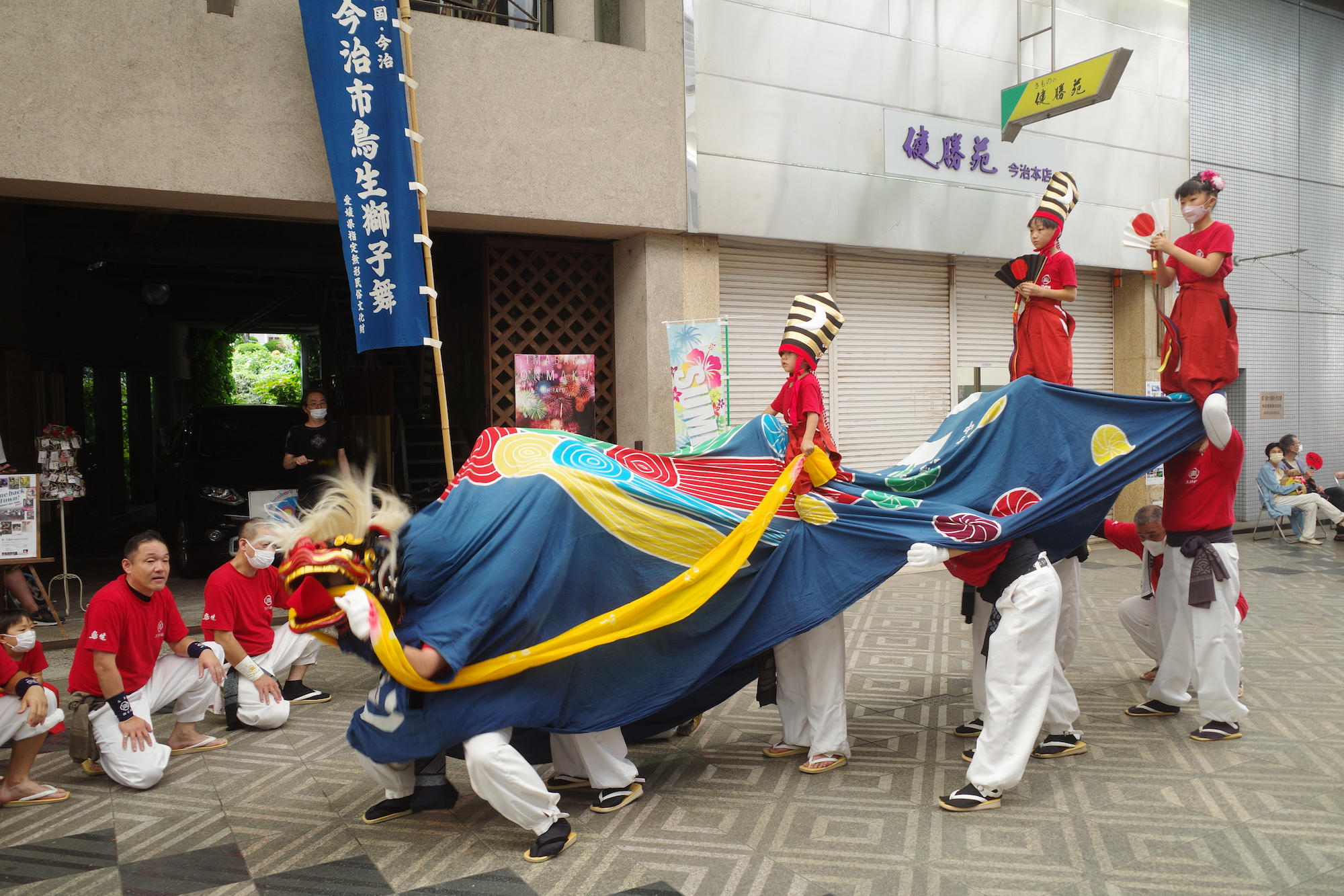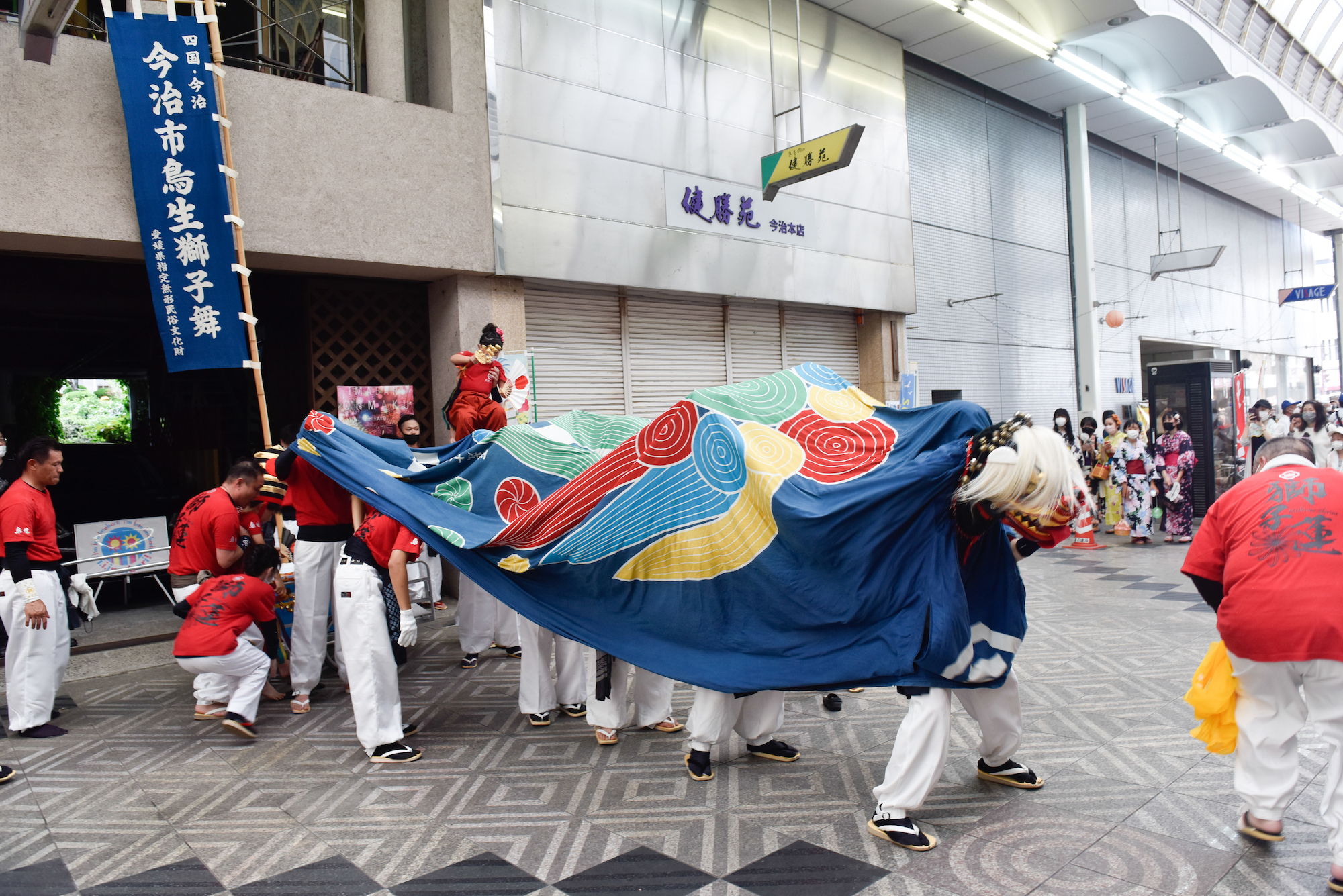 それではここで、8月7日の夕方に今治市内で行われた市民のお祭り「おんまく」に訪問して拝見した継ぎ獅子の様子を振り返りたい。