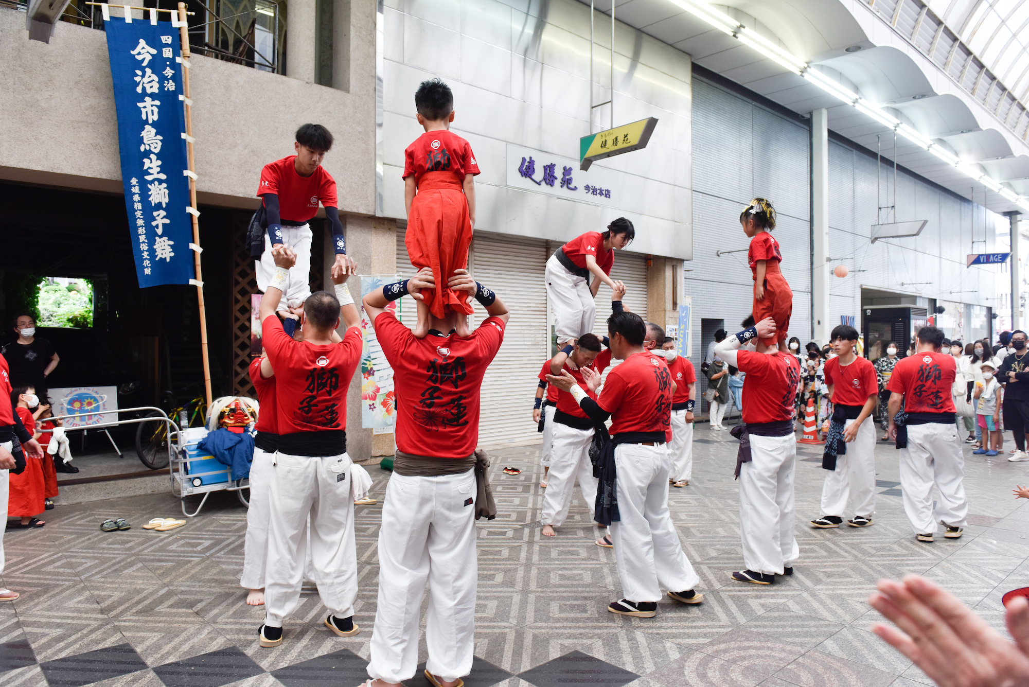二継ぎ、三継ぎ、四継ぎ…。獅子はどんどん高くなる。一番下の人は肩の上に人を乗せ、そのまた上に人が乗る。頂点に立つのは子どもであり、不安な顔一つせずに堂々としている。