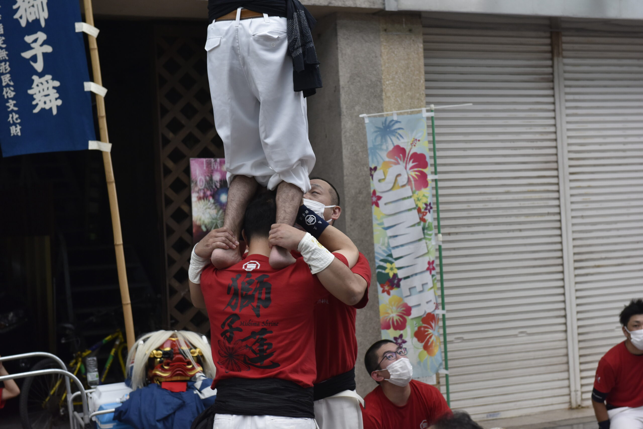 頂点の獅子児は、単に肩車をしてもらうだけでなく様々な芸を披露する。例えば、このように肩の上に立つこともある。