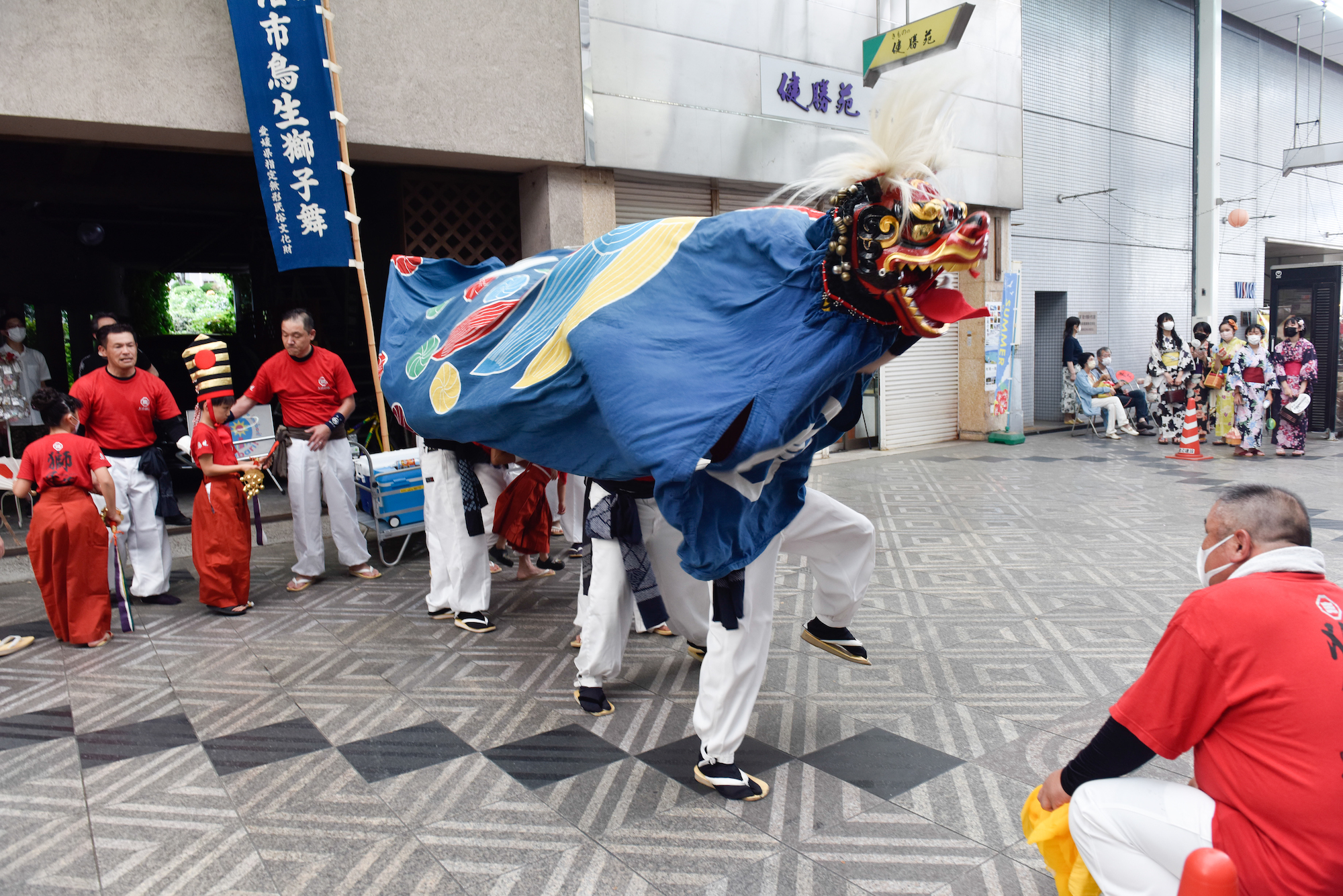 獅子舞は口を開けると、赤い舌のようなものが出てくるのが可愛らしい。舞い方は上下動がかなり激しく、獅子頭に取り付けられた銀色の鈴がシャンシャンと鳴る。