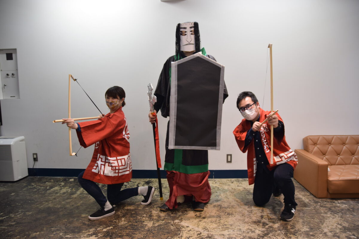 しかし、現代では自分で声を出さなくても、代わりに声を出してくれる文明の利器があるのが嬉しいところ。ここまでの儀式の内容や衣装、動きなどは、すべて実際の平安神宮の過去の大儺之儀の動画を見ながら再現していたので、本物の声をここで流せばOKなのです。
