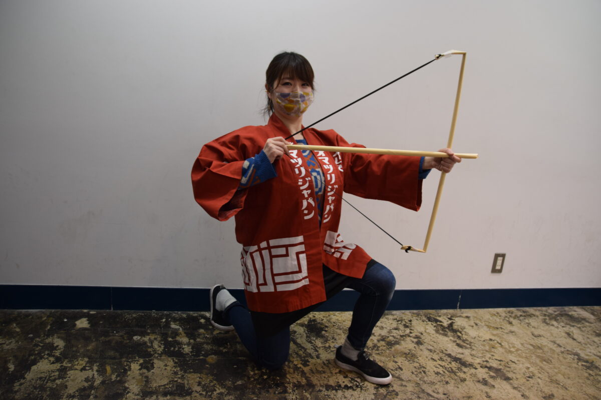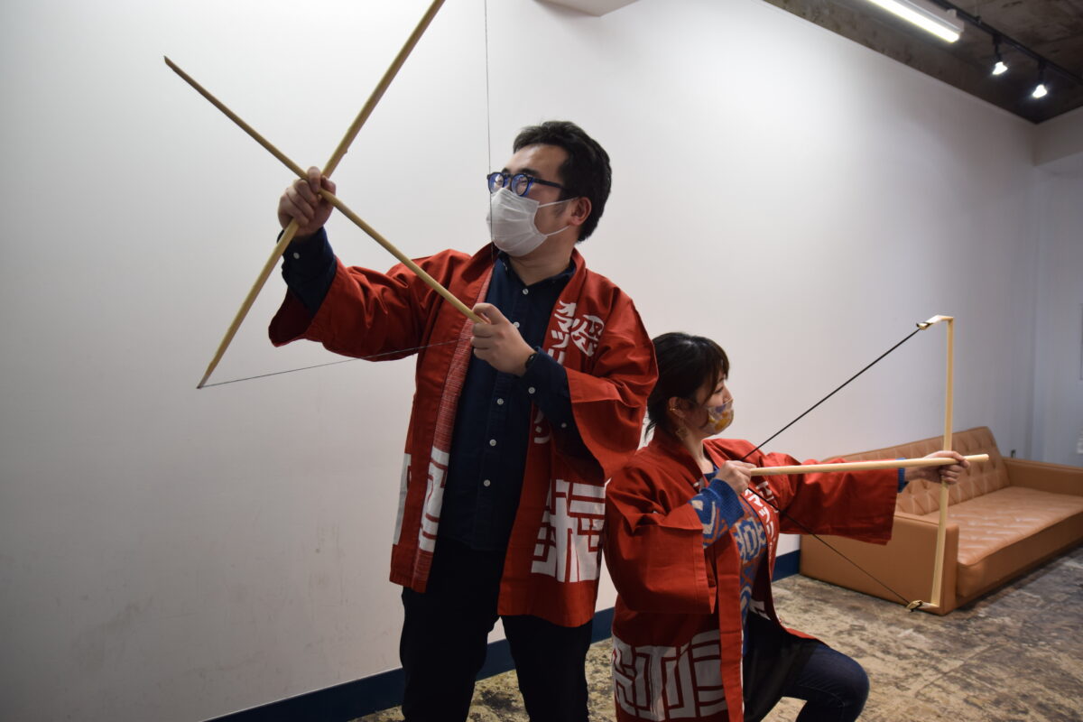 そこですかさず、上卿(しょうけい)役の2人にバトンタッチ。桃で作った弓に、これもまた邪気を払う効果があるという葦でできた矢をつがえます。