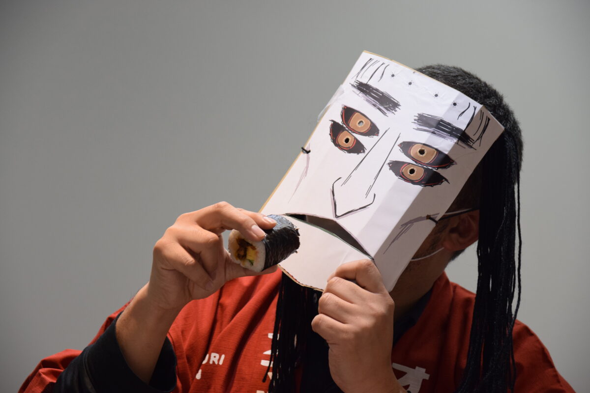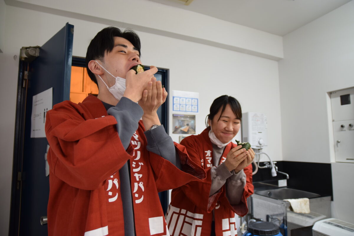 衣装を着替え、オフタイムに戻った方相氏さん。恵方巻を美味しくいただきました。