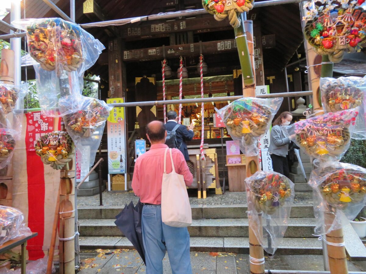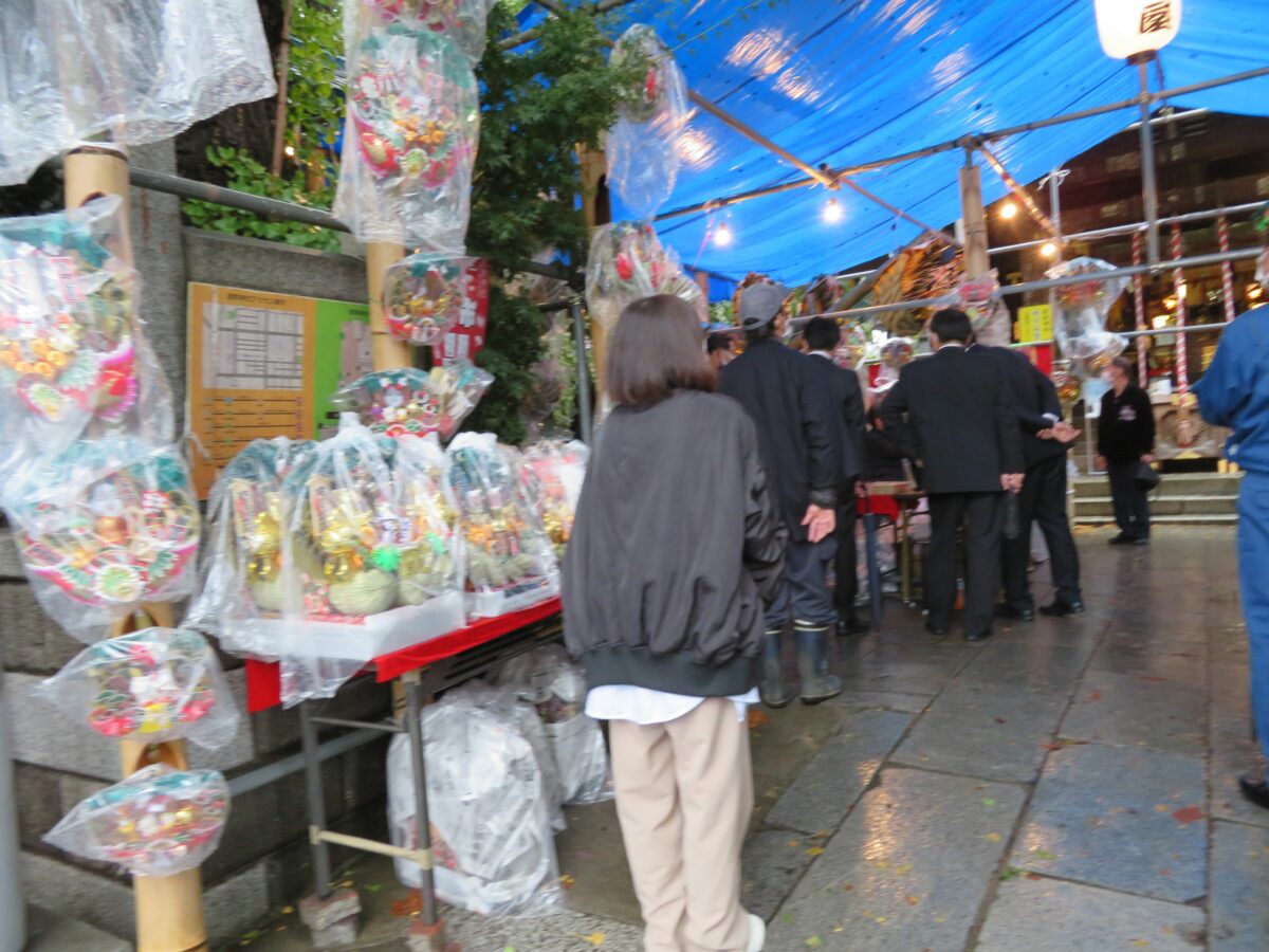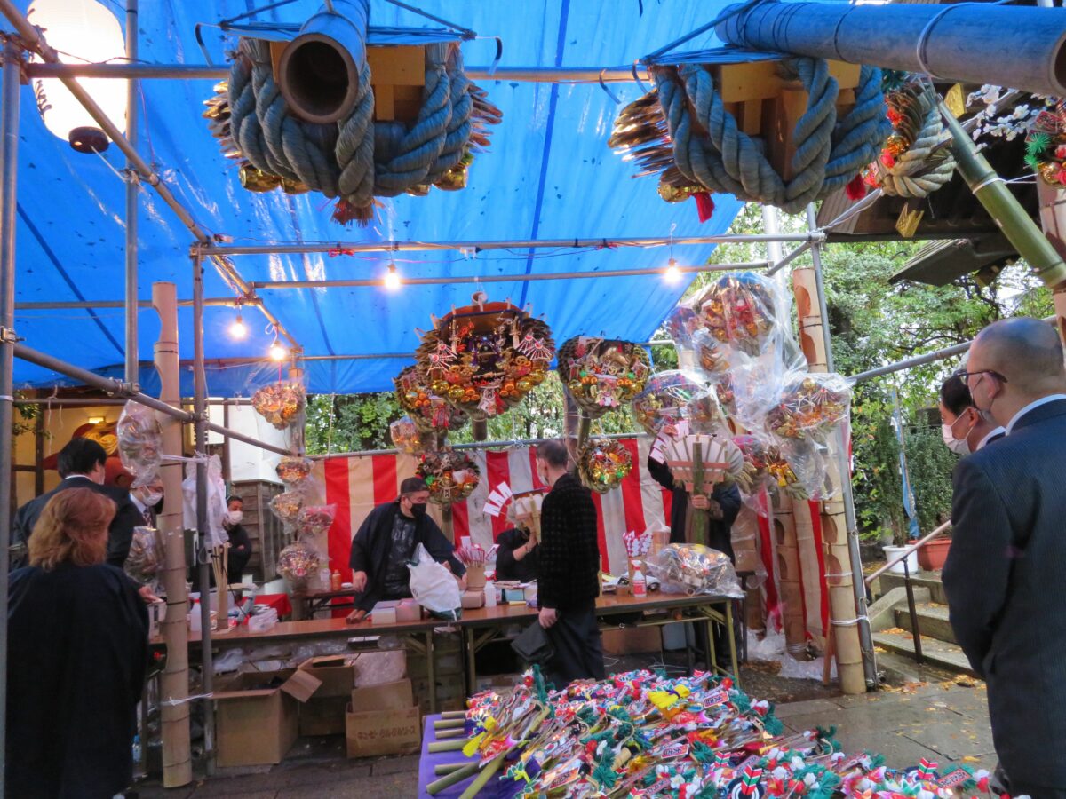 本社や授与所の北に広がる境内は数十メートル四方しかないため、酉の市の日には境内は熊手で埋め尽くされるようです。近くの企業や商店の人々が商売繁盛を願って熊手を購入すると、境内には手打ちの音が響きます。