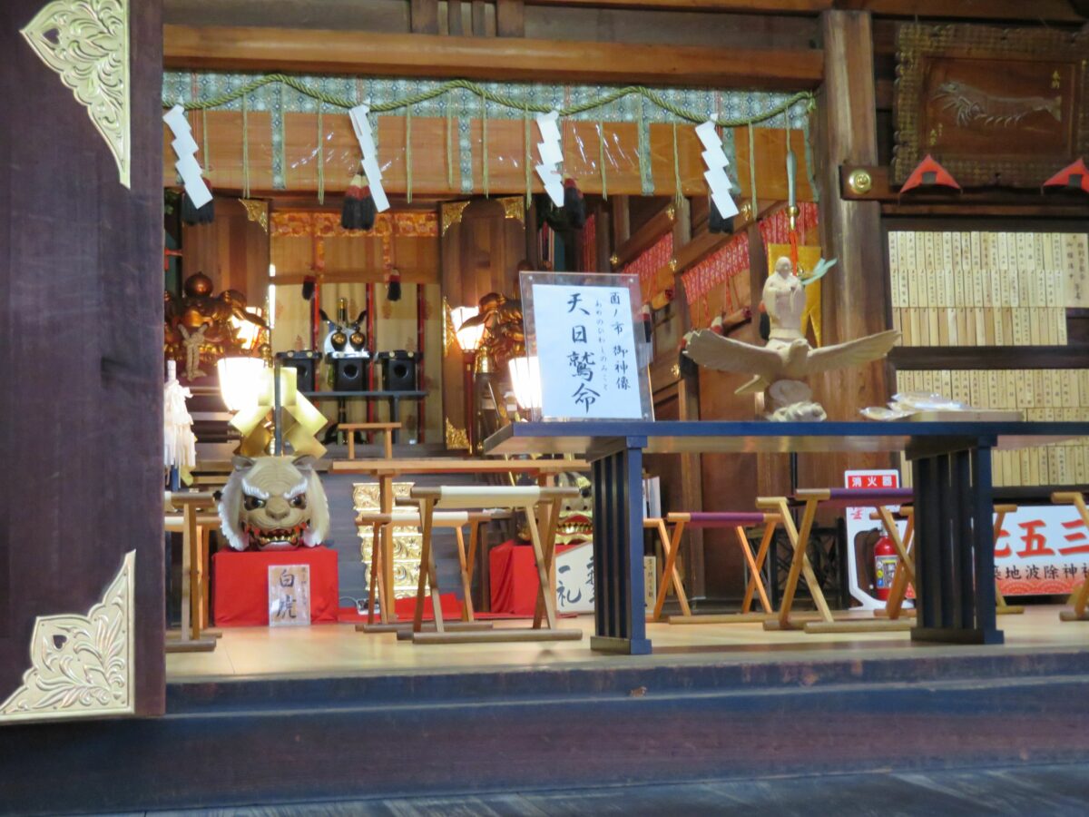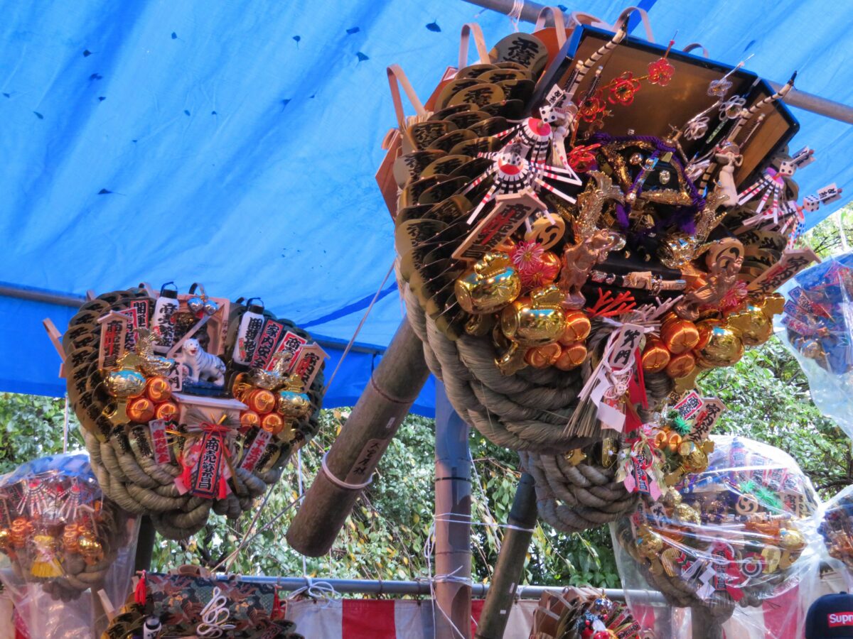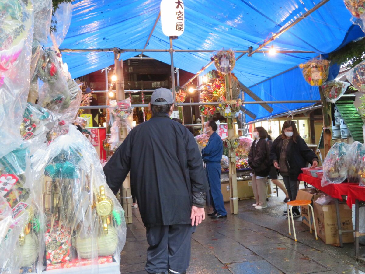 本社や授与所の北に広がる境内は数十メートル四方しかないため、酉の市の日には境内は熊手で埋め尽くされるようです。近くの企業や商店の人々が商売繁盛を願って熊手を購入すると、境内には手打ちの音が響きます。