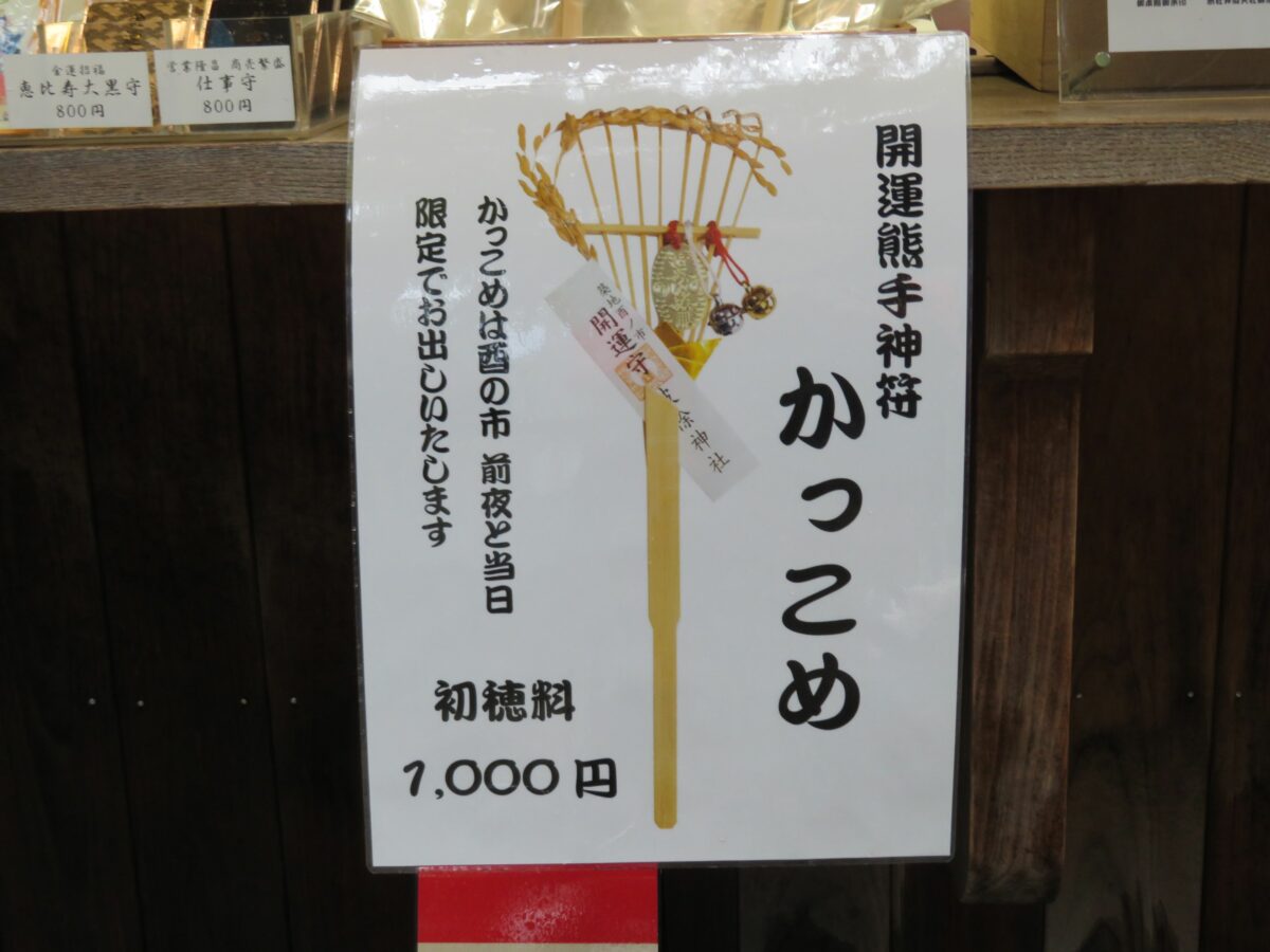 酉の市の開催日には、本社に隣接する授与所に開運熊手神符「かっこめ」が準備されます。八本爪の熊手に稲穂、小判、金銀の鈴、開運神符が添えられているので、幸運をかきこむことができることでしょう。