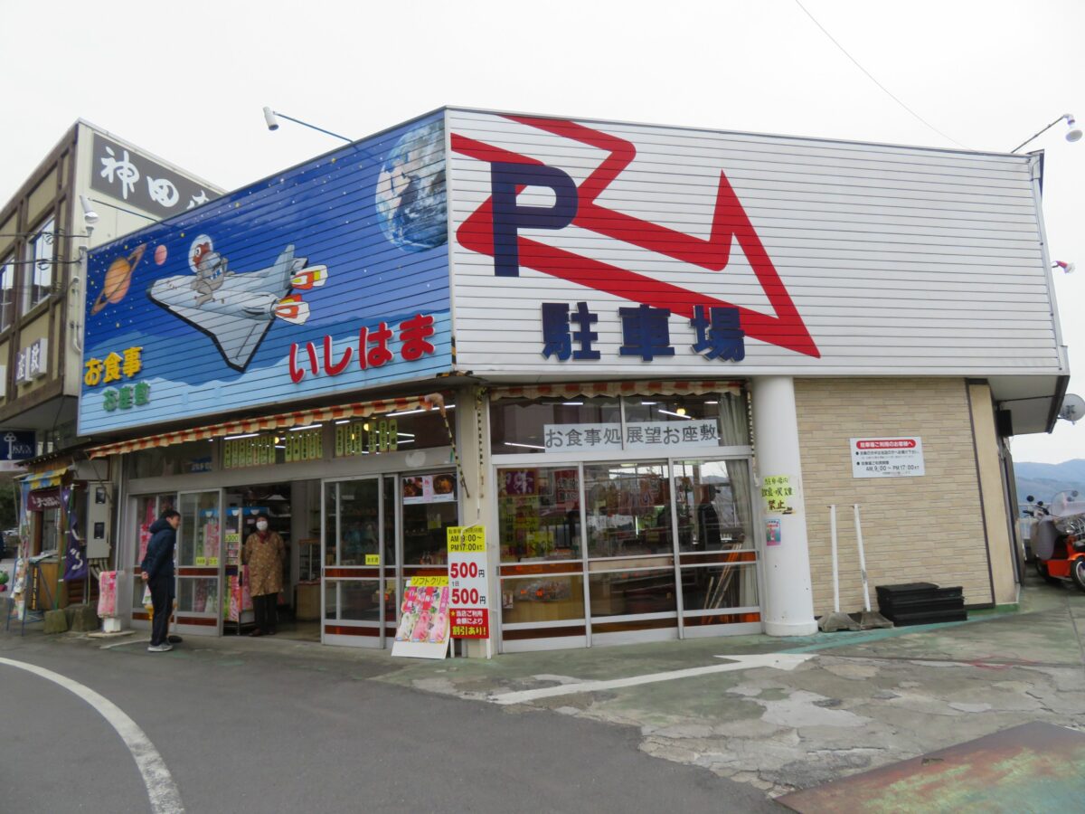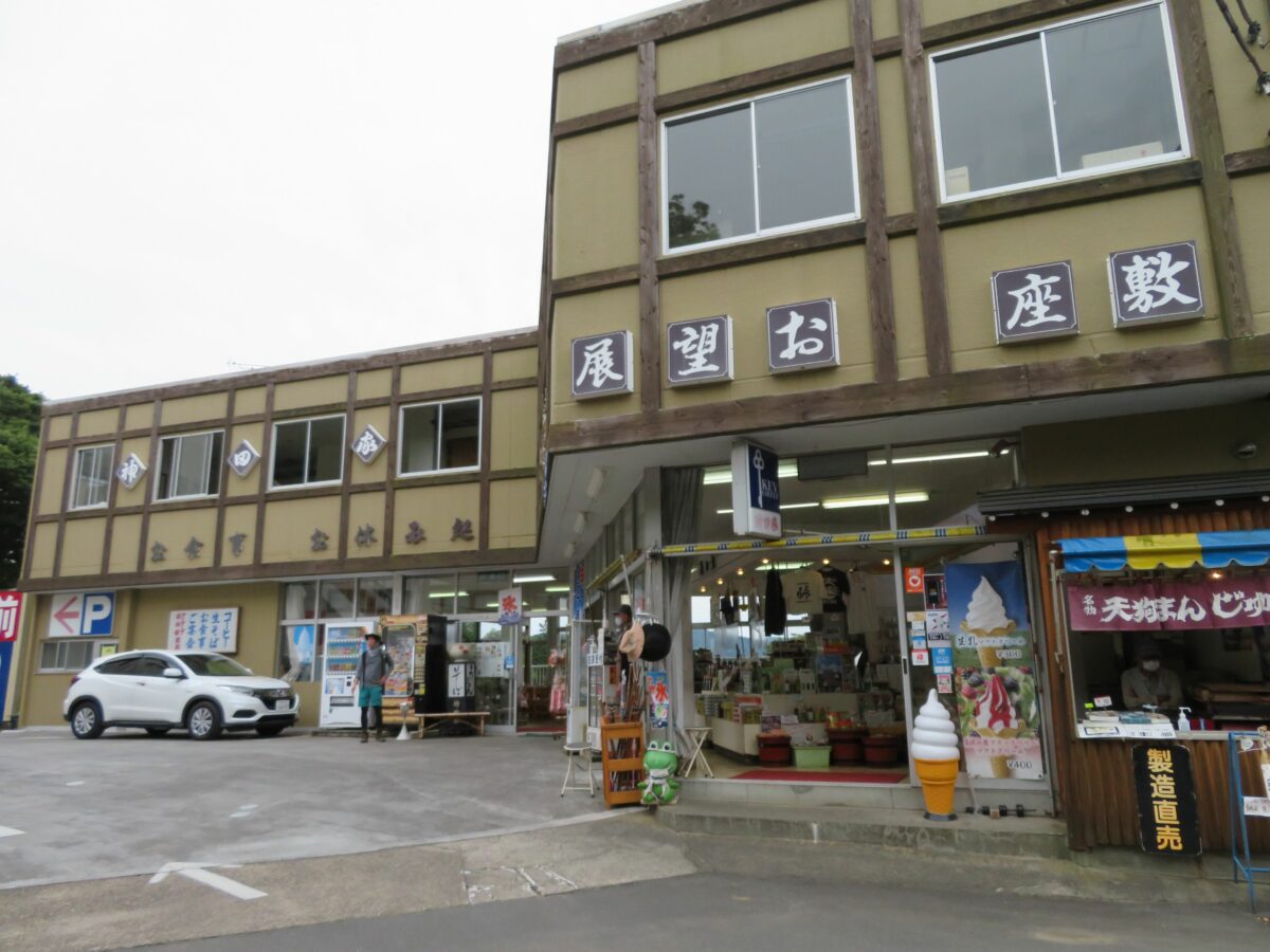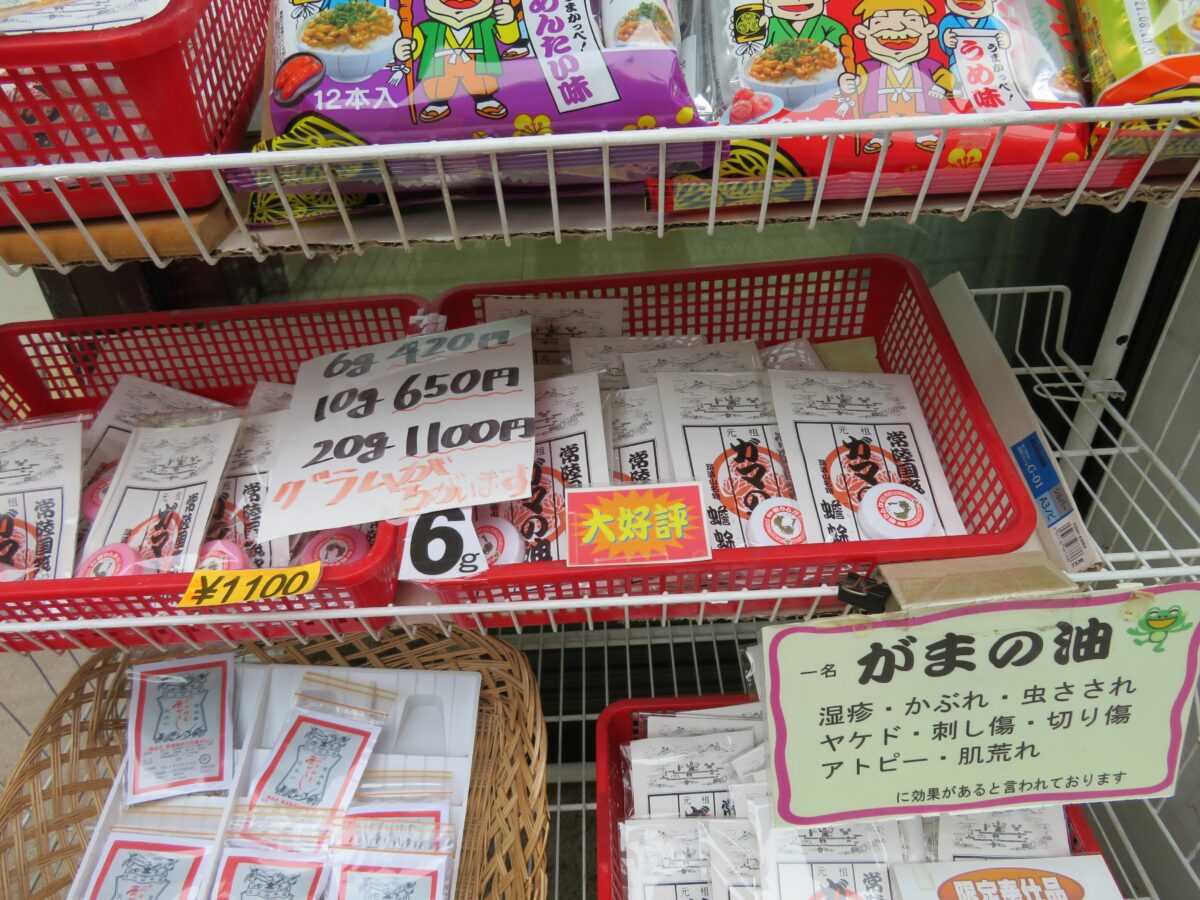 筑波山神社の大鳥居からバス道路沿いには、飲食店や土産物店が軒を連ねています。飲食店では「つくばうどん」がご当地グルメとして定着しつつあります。「つ」=つくね、「く」=くろ野菜、「ば」=バラ肉の入ったうどんです。土産物店では霊力を持った四六のガマの置物や油などを販売しています。