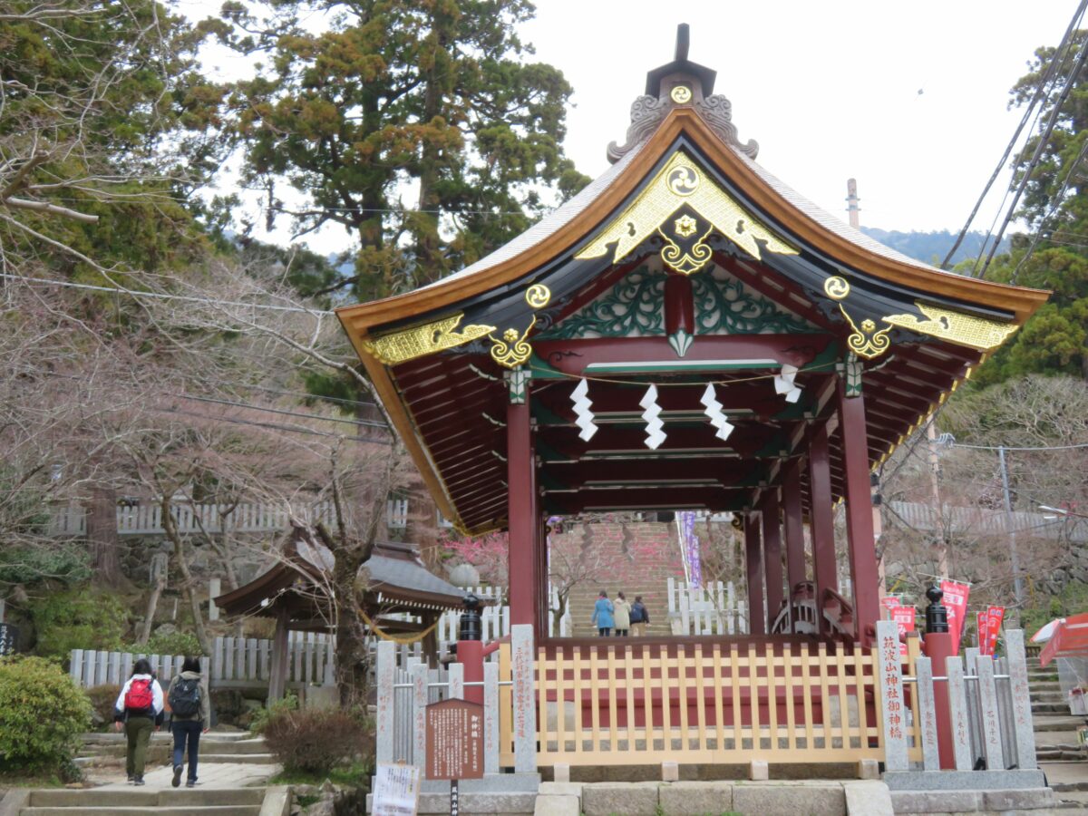 筑波山とつくばエクスプレスのつくば駅を結ぶ、筑波山シャトルバスのバス停の横の大鳥居が神社の玄関です。大鳥居の下からなだらかな坂道の参道が拝殿に導いています。参道を歩き始めて最初に目に見えるのが神橋です。1633年に江戸幕府第3代将軍の徳川家光によって寄進されたと伝わります。切妻造小羽葺屋根付の反橋は、安土桃山時代に盛んに用いられた建築様式です。