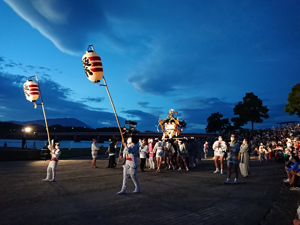 夕刻の薄明りの空の下、祭りの華である神輿も登場しました。
