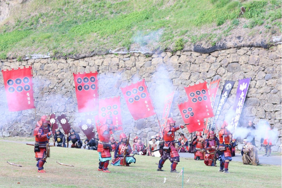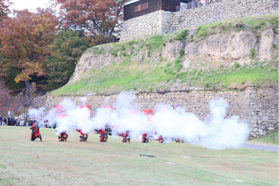 上田城跡公園のやぐら下芝生広場で行われる「全国鉄砲演武大会」も見どころ。全国各地で活躍する鉄砲隊が鉄砲演武を披露。