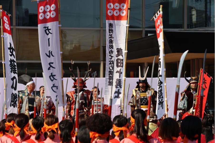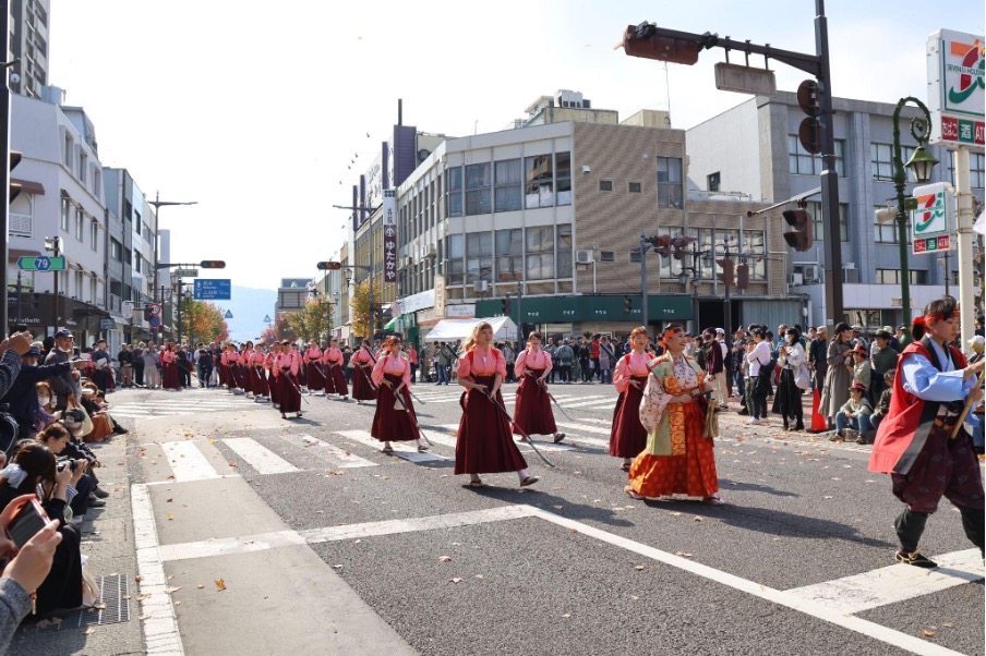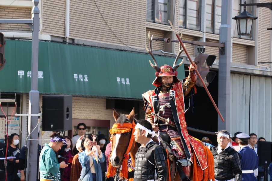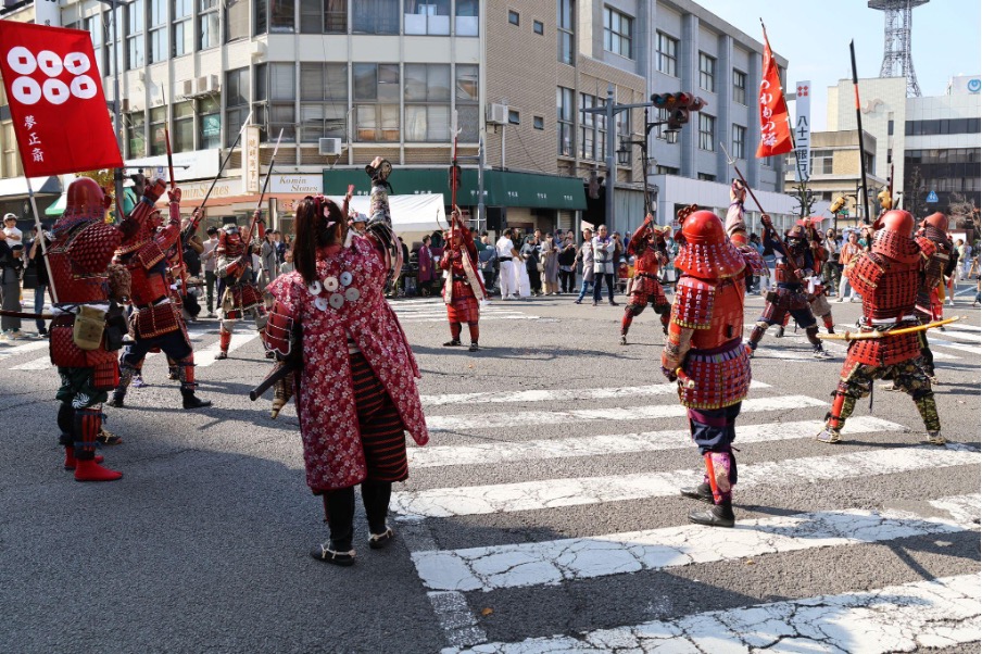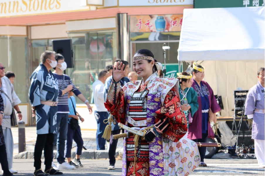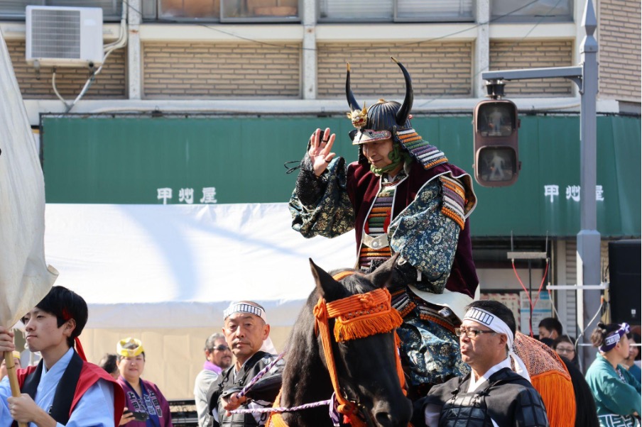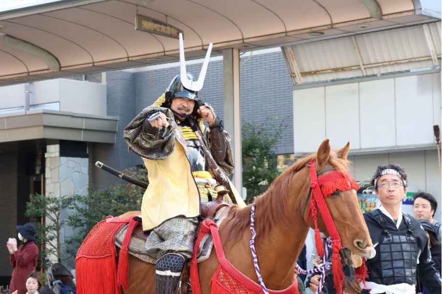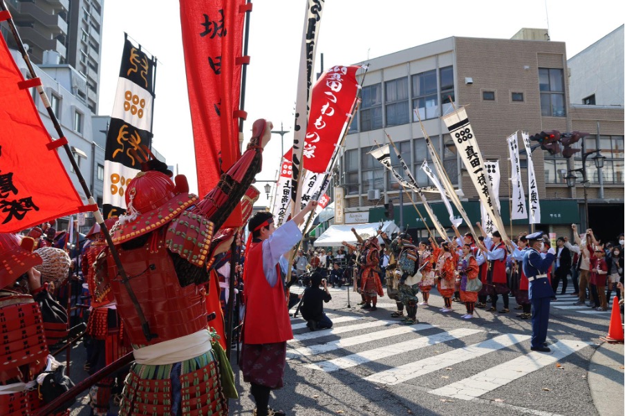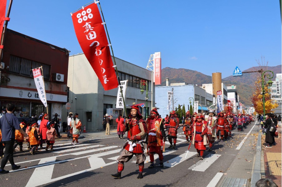 真田三代(幸隆・昌幸・幸村)や奥方、真田十勇士、甲冑隊、薙刀隊などが列をなして市街地を行進します。過去には、大河ドラマ『真田丸』で真田昌幸役を演じた草刈正雄さんなどの出演者が来たこともありました。