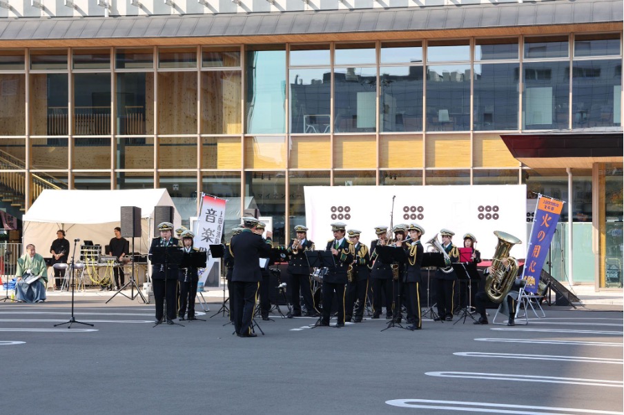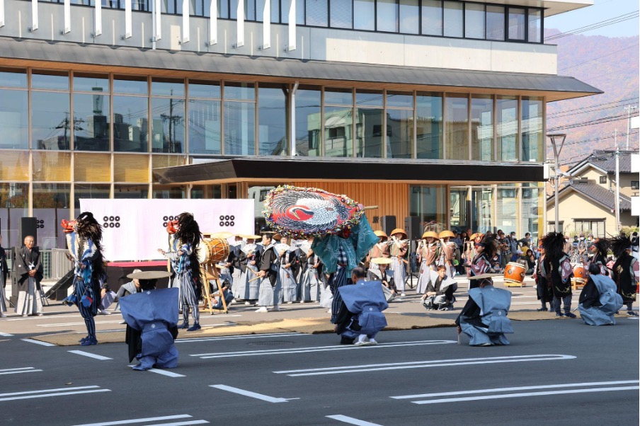 当日は、真田三代武者行列の出発地点となる上田市役所前に参加者が集結!消防団音楽隊による演奏に始まり、上田城築城の際に奉納されたという上田獅子や、出陣太鼓の勇壮な演奏で幕を開けました。これから始まるぞ!という熱気が伝わってきます。