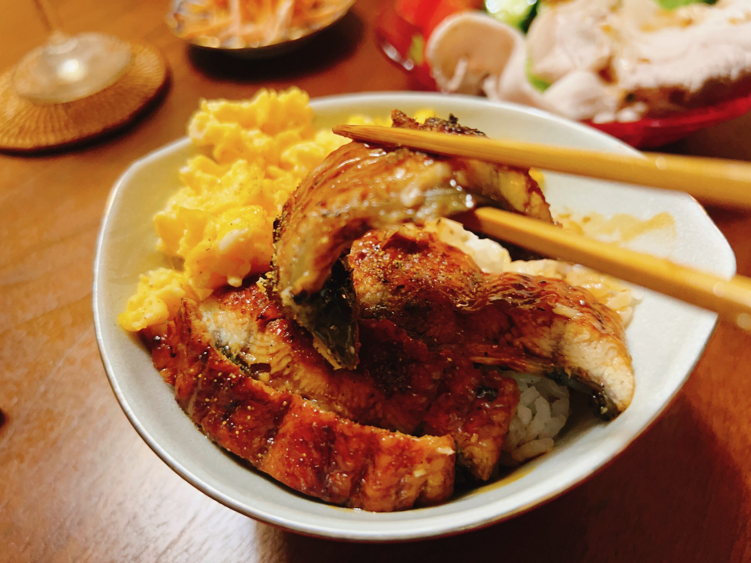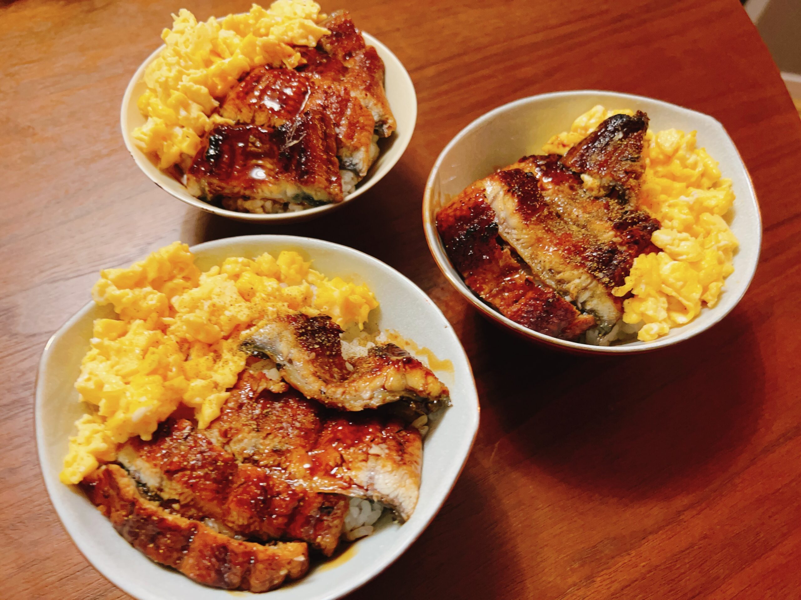 写真は、「特うな皿」を子どもを含む3人前のごはんに乗せたイメージです。どうですか?1370円でおいしそうなミニうな丼が3人前出来上がりました!ポイントはうなぎを、垂直に切り分けるのではなく、斜めにスライスする「そぎ切り」をして、ずらしながら盛り付けること!こうすることでうなぎの表面積が広がって、ボリューム感を出すことができます。また、筆者はミニどんぶりの空いた部分に炒り卵を一緒に乗せました◎ タレと卵の相性もGOODです!