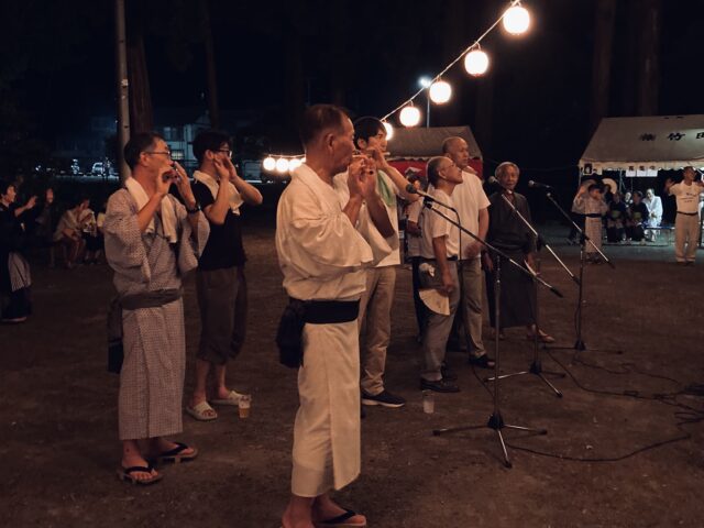 唄、篠笛、太鼓という構成で、唄は4人ほどの音頭取りが二対となり、交互に歌い合う掛け合い式で行われます。(以前は踊り手と掛け合いをしていたそう)15番まである唄を30分ほどかけてゆっくりと唄われます。