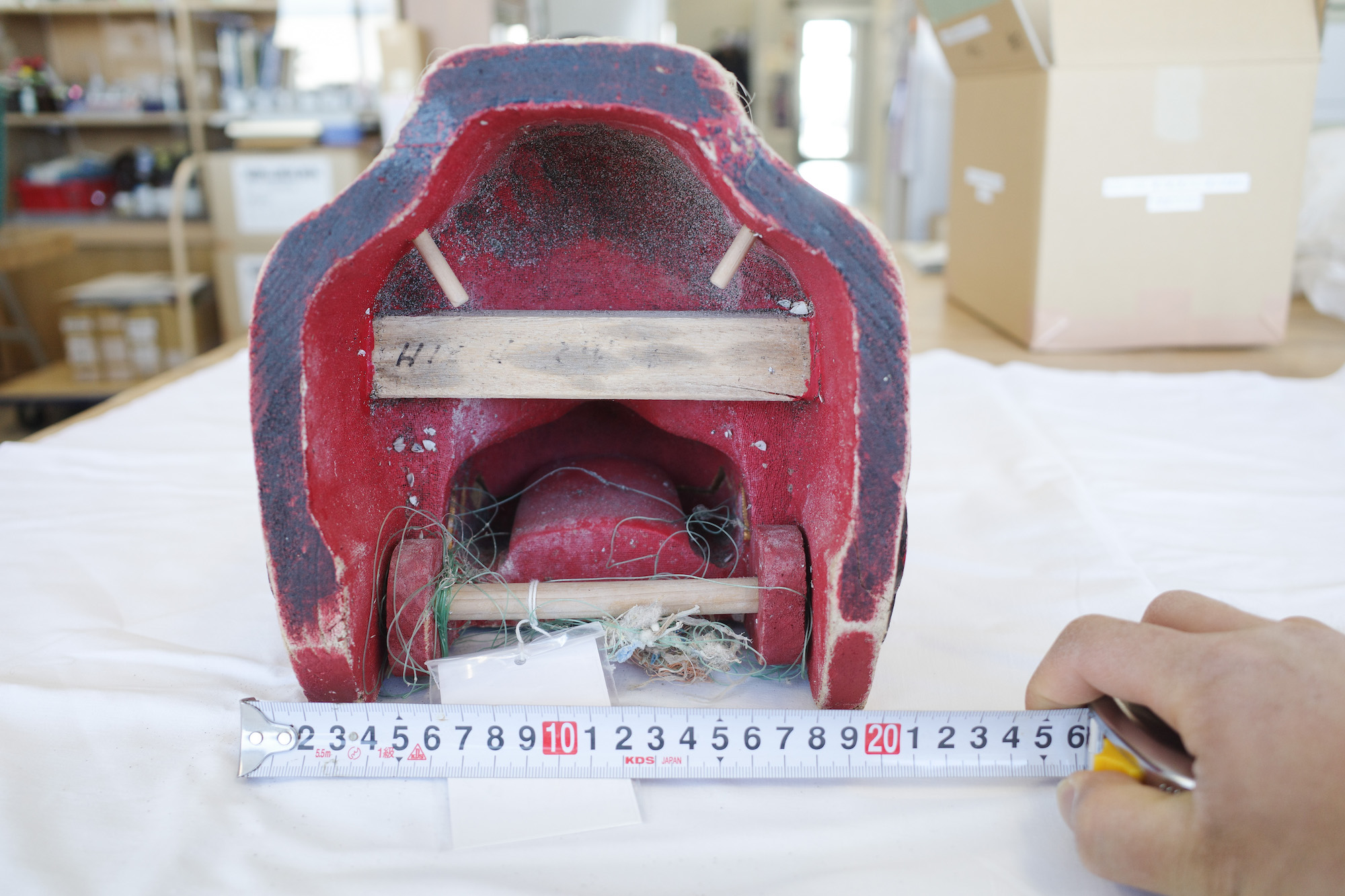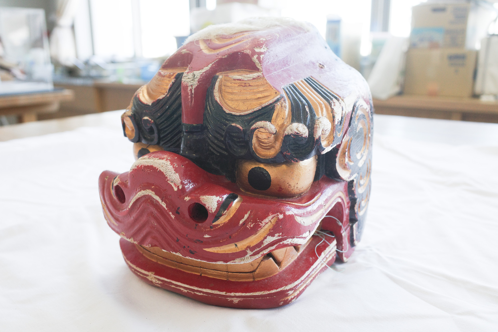 博物館に入ると早速、学芸員の方に漂着した獅子頭を見せていただいた。この獅子頭は実際に展示されているわけではない。白い布に包まれており、奥の倉庫に保管されているとのこと。こちらがその獅子頭だ!
