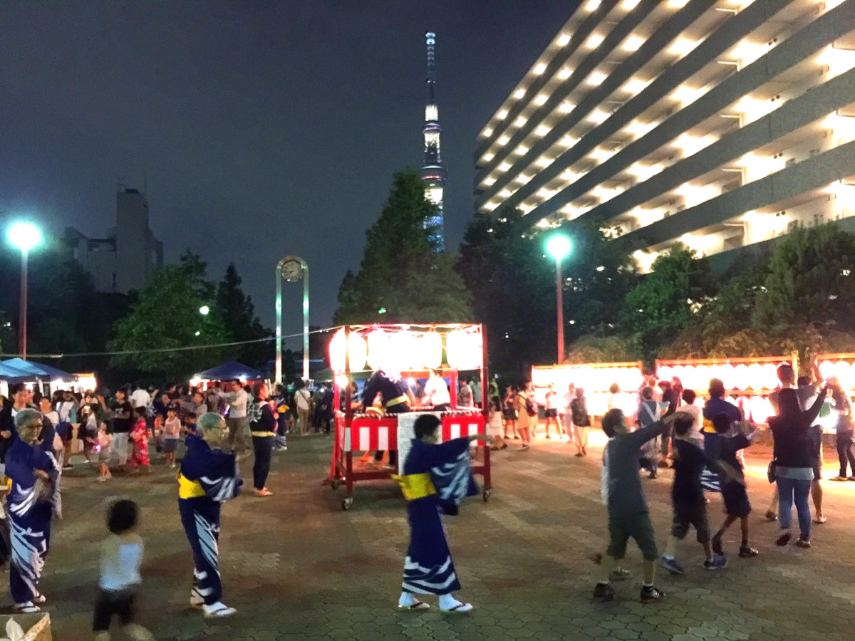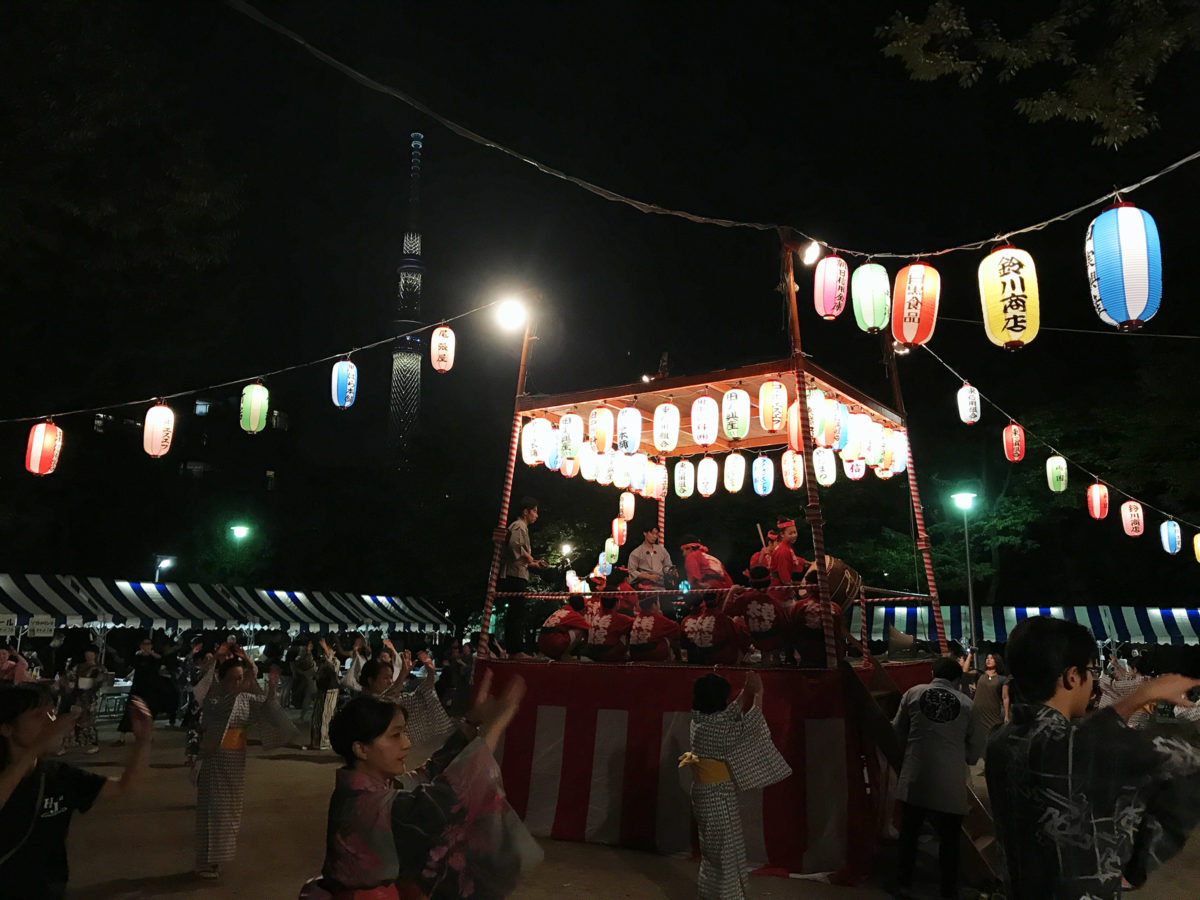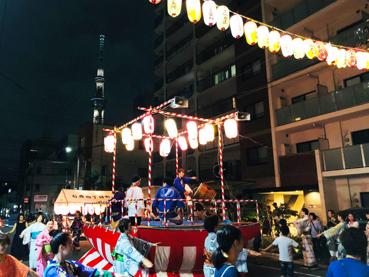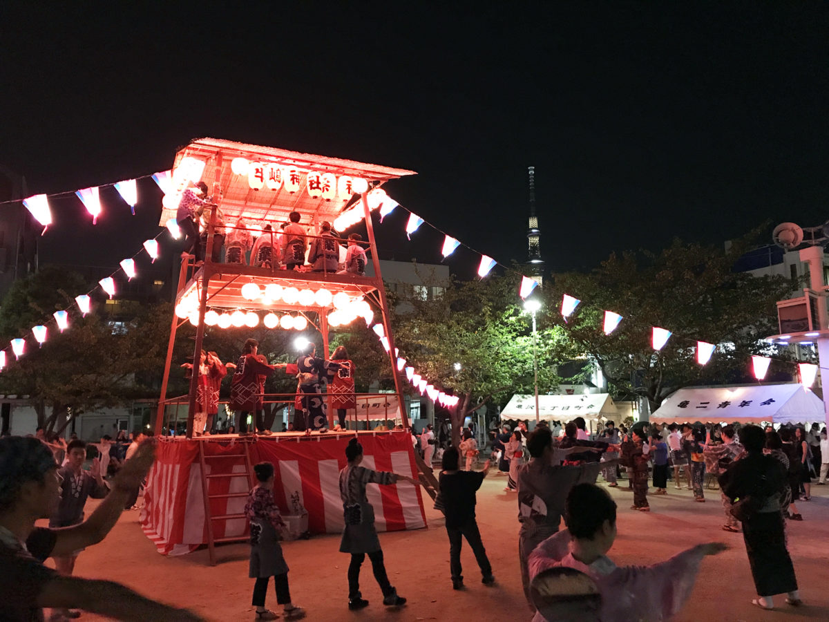 東京スカイツリーの絶景を見ながら踊りを楽しめる。吾妻橋二丁目町会