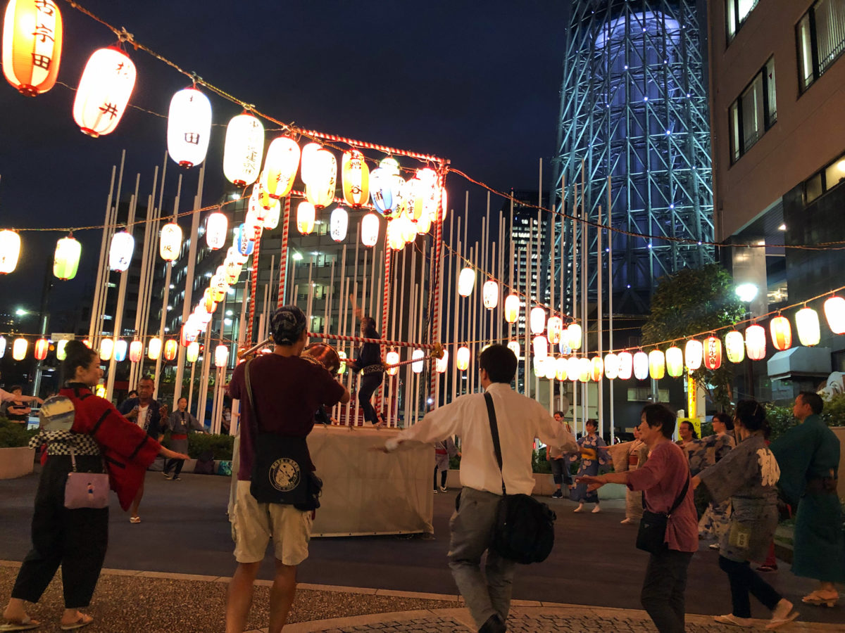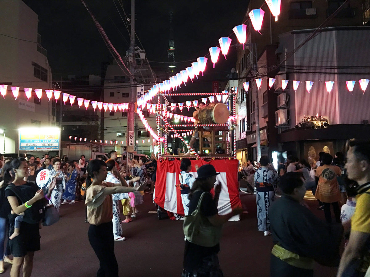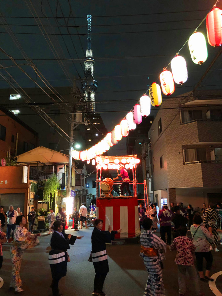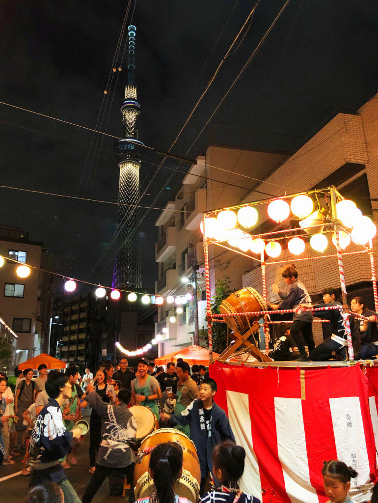 東京スカイツリーの絶景を見ながら踊りを楽しめる。吾妻橋二丁目町会