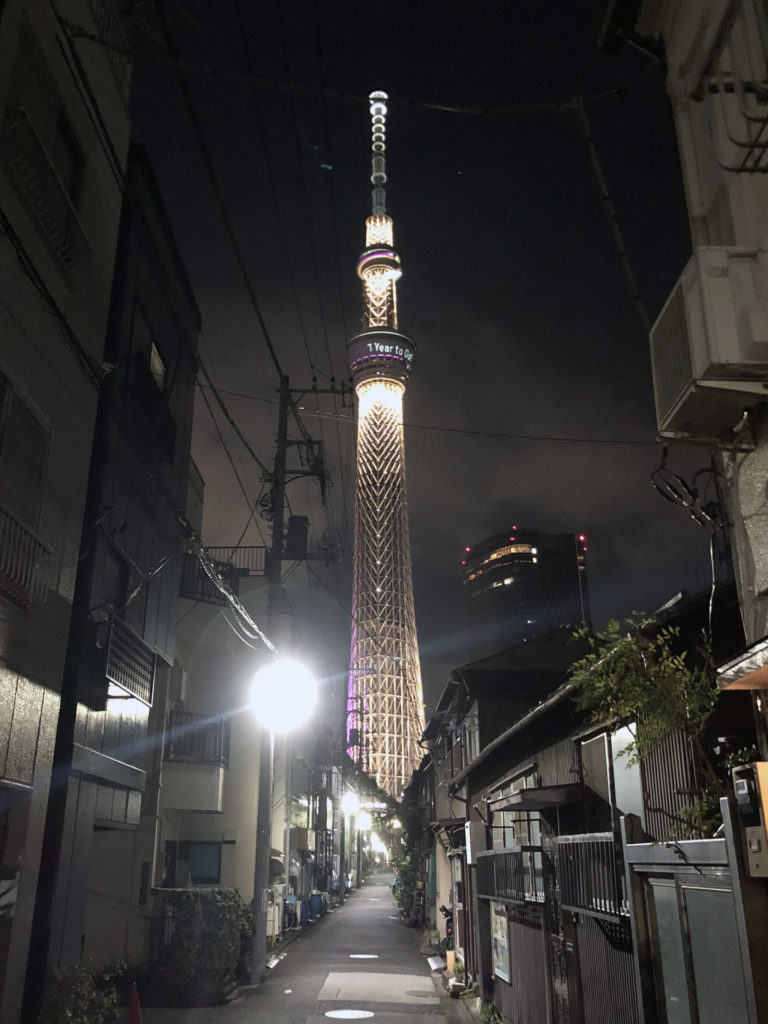 この地域で踊ると、どこからも東京スカイツリーの姿を眺めることができる。昭和の町並みとモダンなタワーとのコントラストも下町ならでは