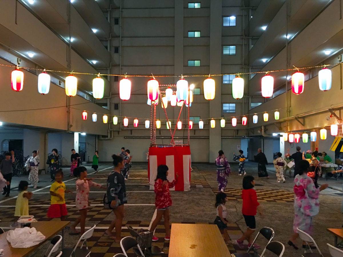 マンションの吹き抜けに提灯を灯して櫓を組む。業平一丁目町会