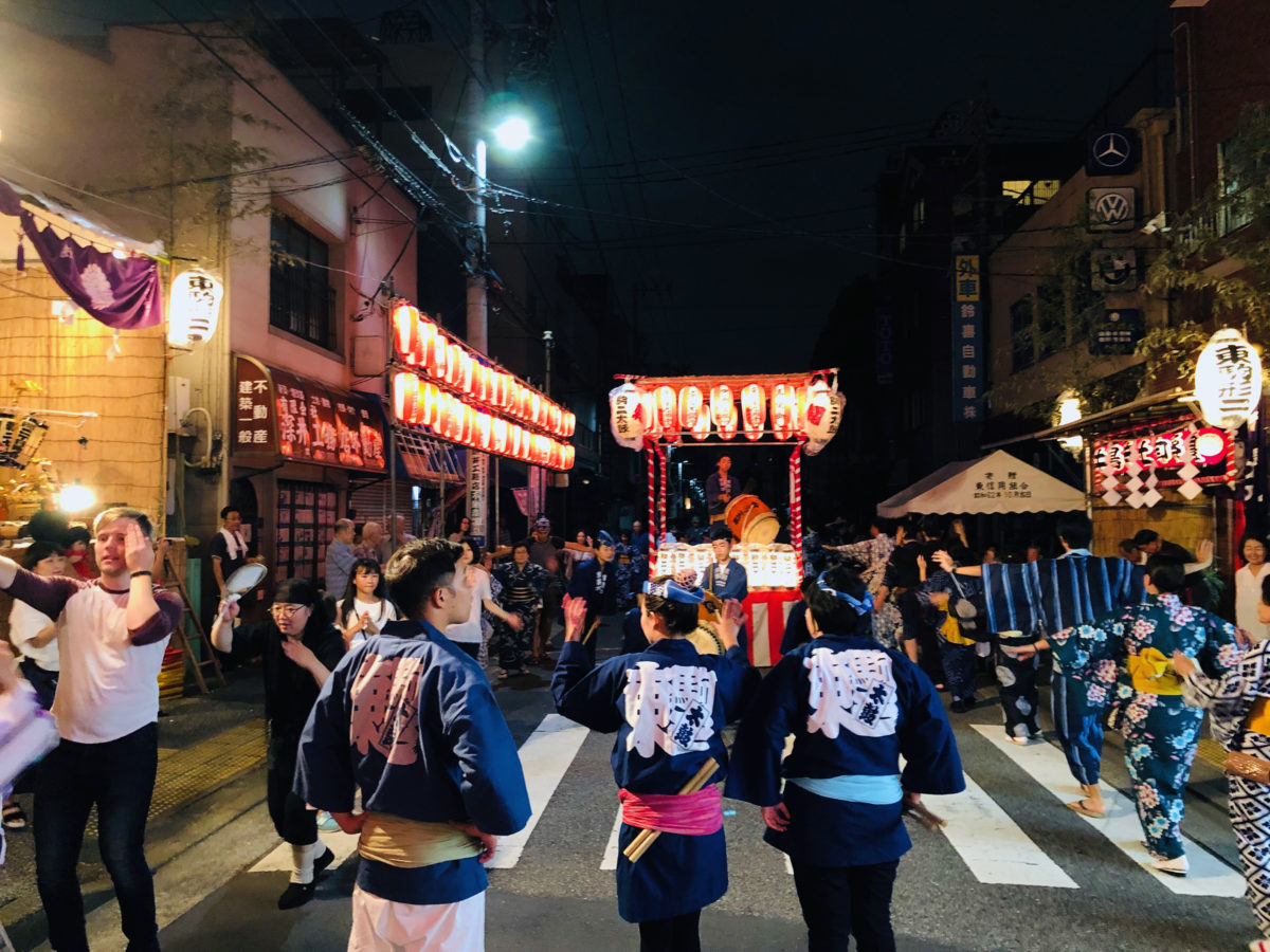 路上で太鼓を囲んで踊る。押上一丁目町会