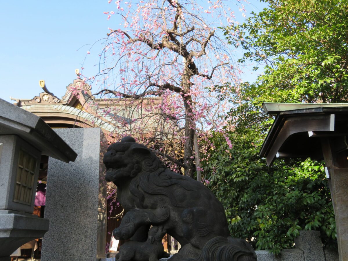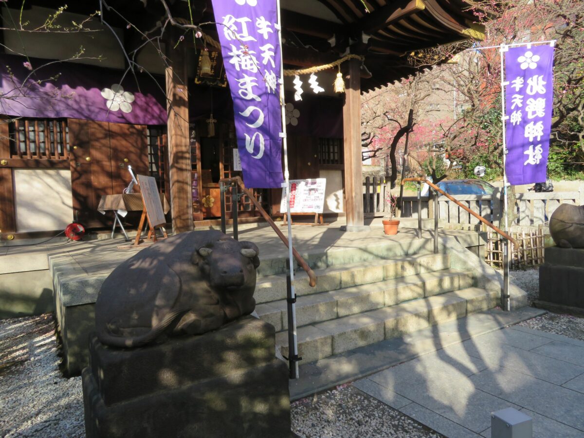 全国各地に点在する神社の境内で様々な動物の像を見かけることがあります。稲荷神社では狐が主役となることが多いのに対して、天満宮や天神社では足を折り曲げて座る牛を見かけることがあります。この臥牛は撫でると願いが叶うと言われています。東京都文京区に社殿を構える牛天神北野神社では、本殿の前で「撫で牛」が参拝者を温かく見守ります。菅原道真をご祭神とする神社の境内には道真が愛した梅が植栽され、例年2月上旬から下旬にかけて季節の彩りで包まれ、「牛天神紅梅まつり」が開催されています。2021年には2月1日~25日の期間で行われました。