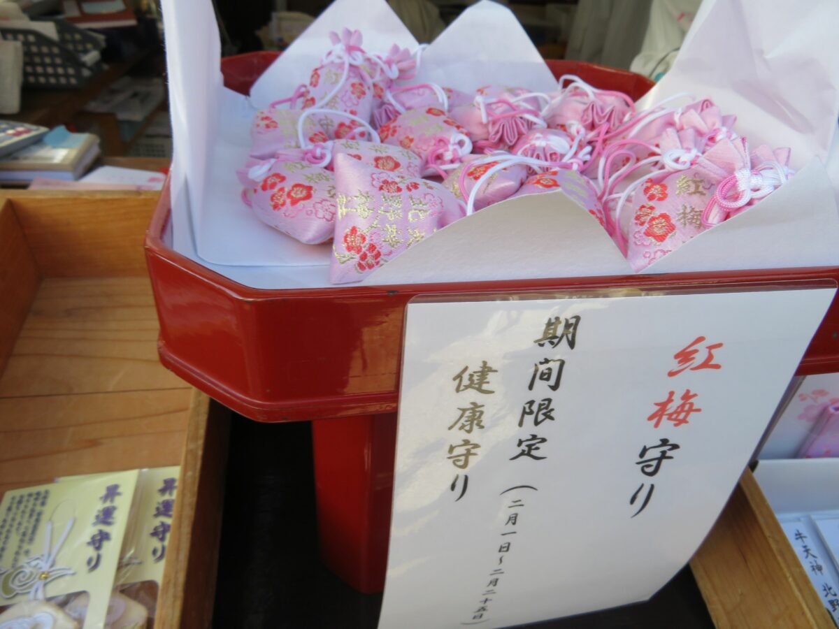 「牛天神紅梅まつり」の期間中には境内で、甘酒、しょうが湯、梅の実などのふるまいが行われます。授与所では期間限定のご朱印やお守りの授与を受けることができるばかりでなく、神社の境内で取れた梅の実を5年から10年寝かせた梅酒の「北野の福紅梅」をゲットすることができます。