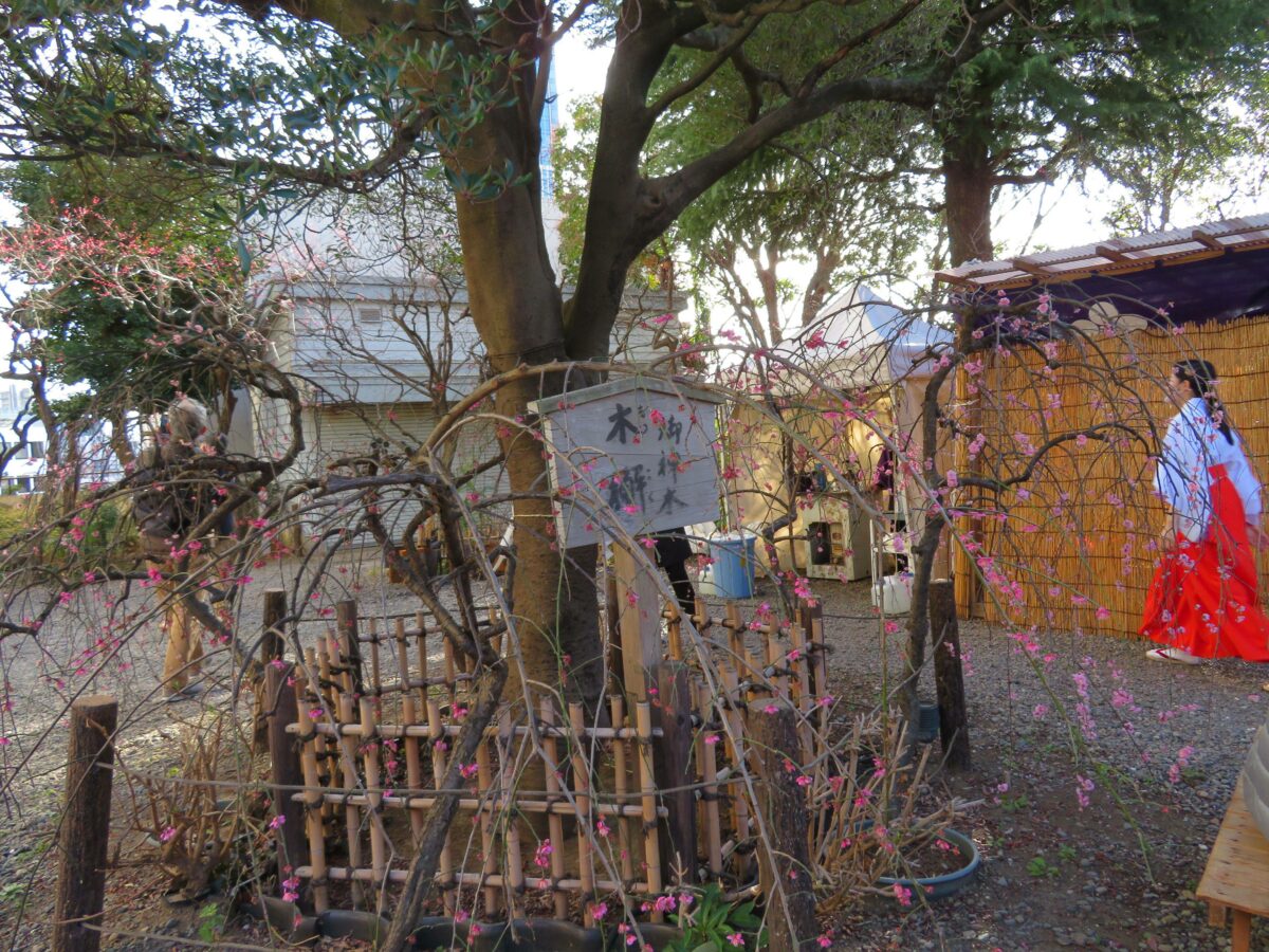 神社には本殿を中心に数十本の紅梅が育てられています。決して数は多くはないのですが、富士梅、豊後梅、桃梅、しだれ梅、寒紅梅など数種類の濃淡の異なる紅色の梅がバランスよく溶け合っています。