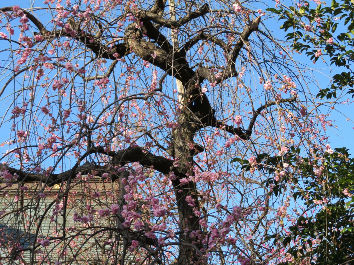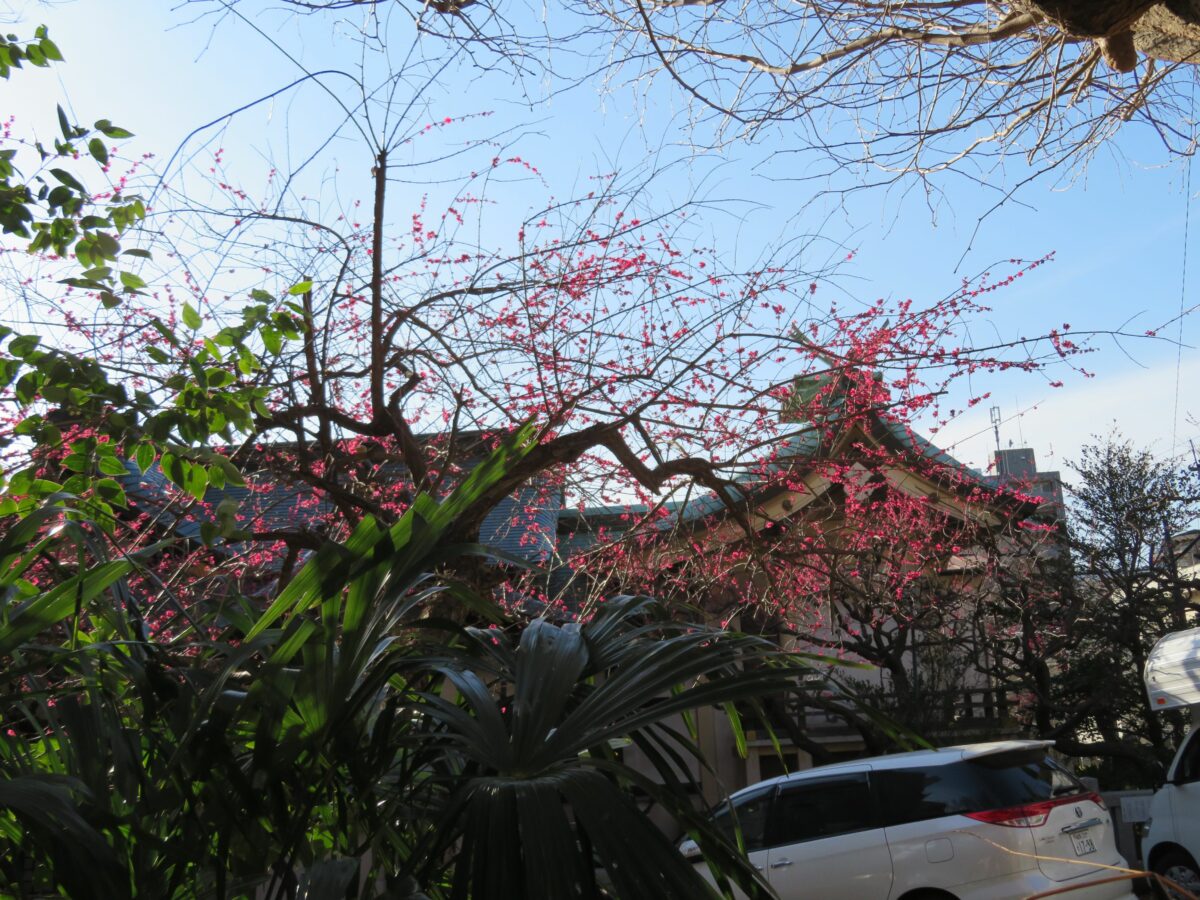 濃淡の異なる数種類の紅梅が豊かな彩りを見せる境内