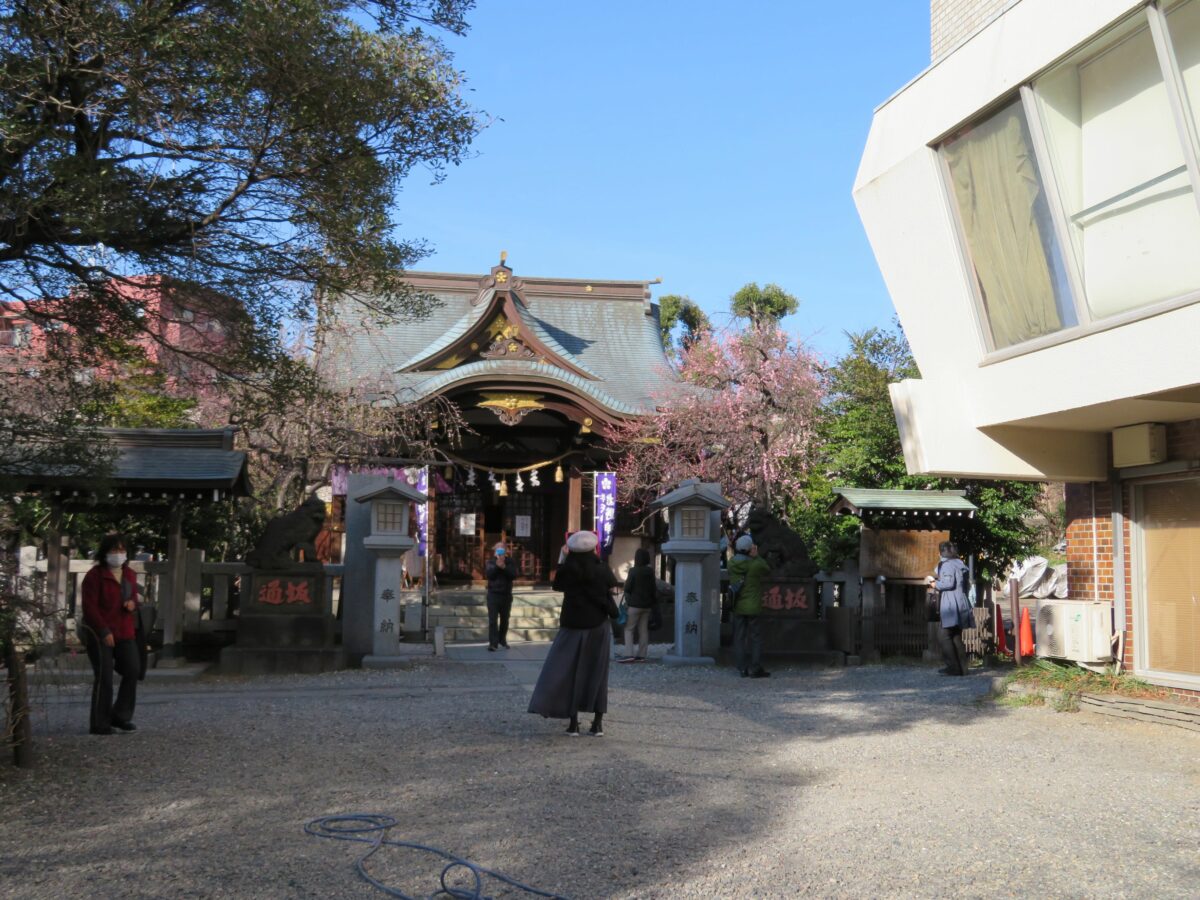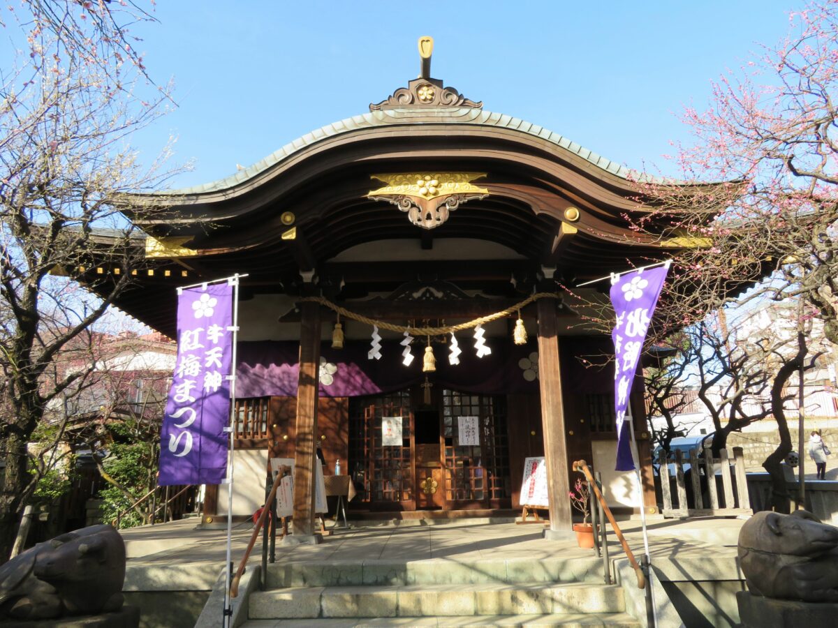 東京都文京区に社殿を構える牛天神北野神社は、菅原道真をご祭神とし、本殿の前で「撫で牛」が参拝者を温かく見守ります。神社の境内には数種類の紅梅が植栽され、例年2月上旬から下旬にかけて濃淡の異なる紅色の花がバランスよく彩ります。