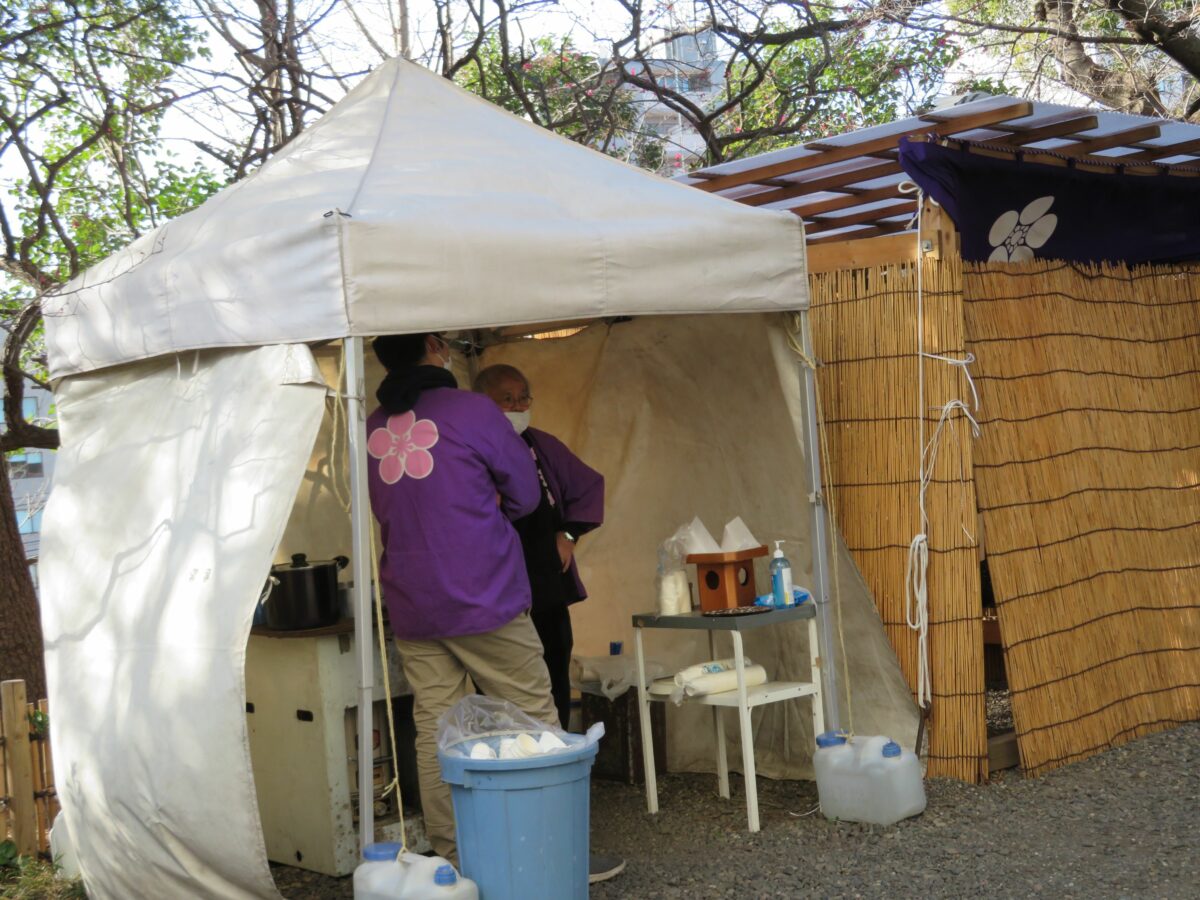 境内でふるまわれる甘酒、しょうが湯、梅の実