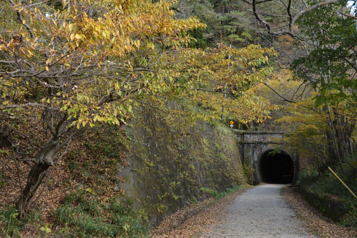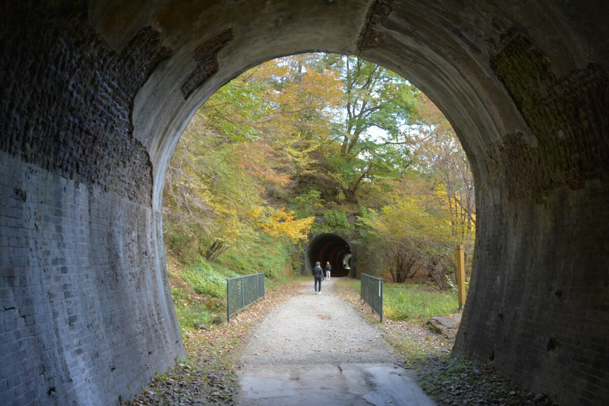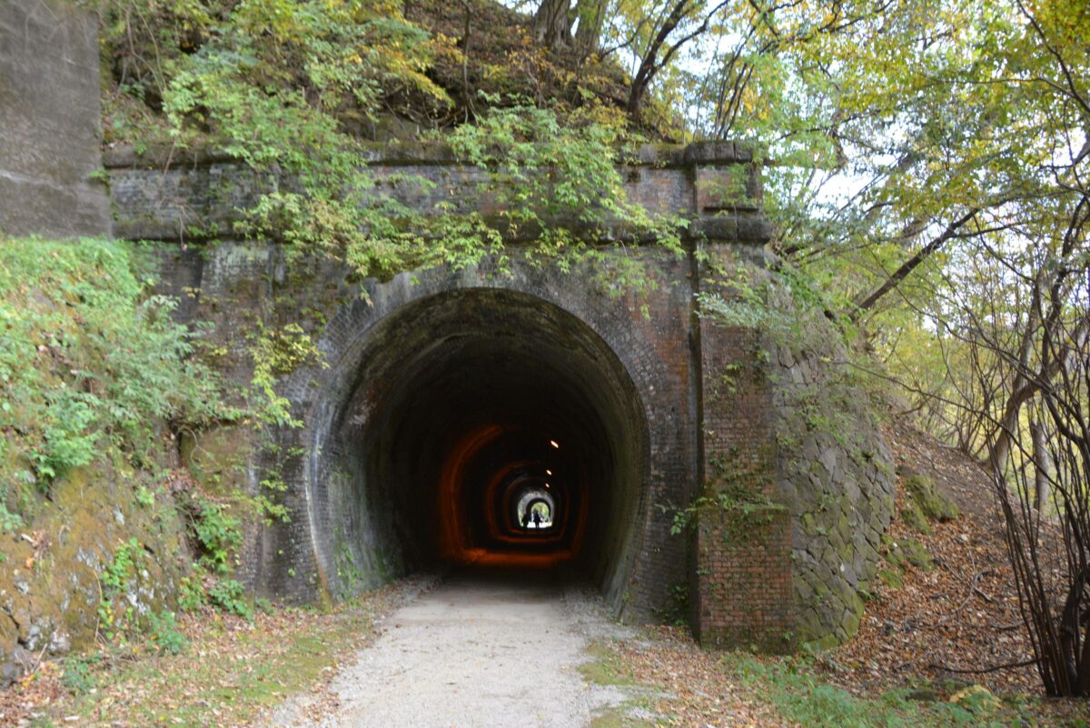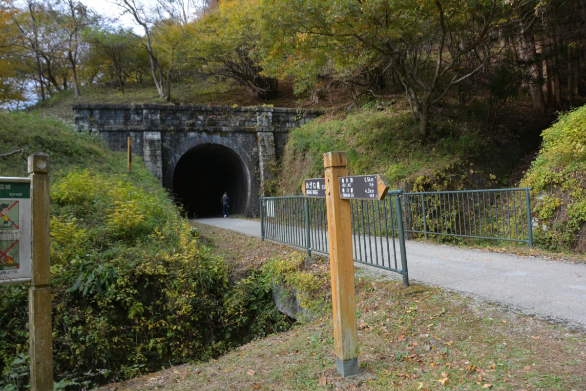 碓氷湖の北東からは、トンネルが「アプトの道」を繋ぎます。5つのトンネルを通過すれば「めがね橋」です。