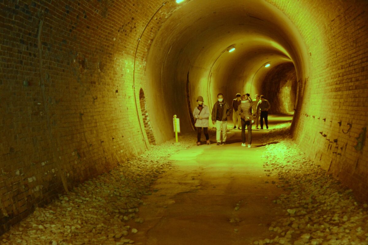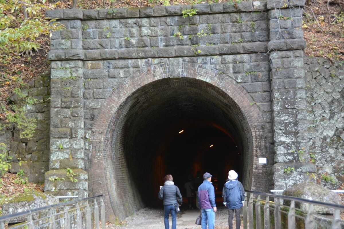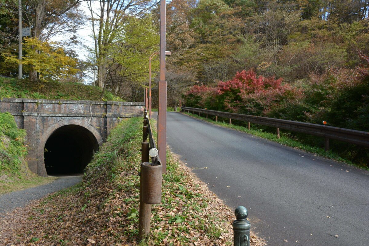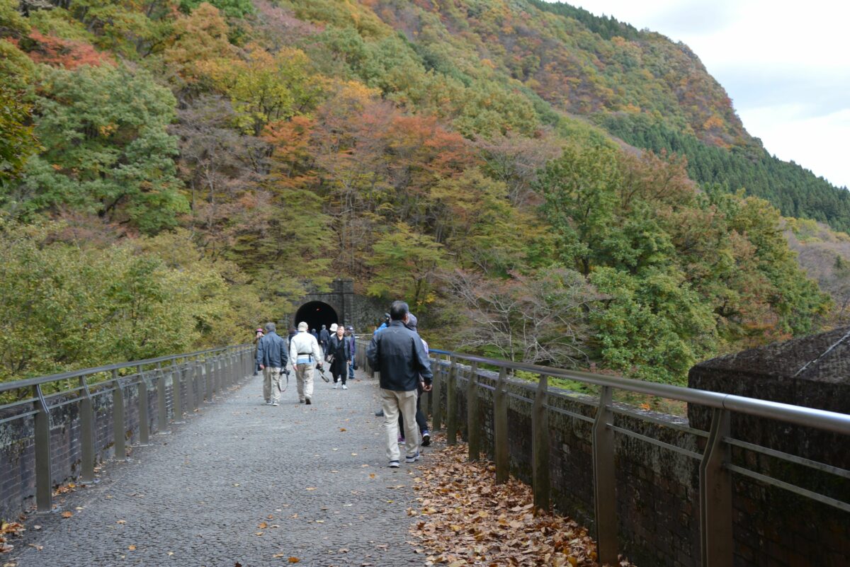 碓氷湖の北東からは、トンネルが「アプトの道」を繋ぎます。5つのトンネルを通過すれば「めがね橋」です。