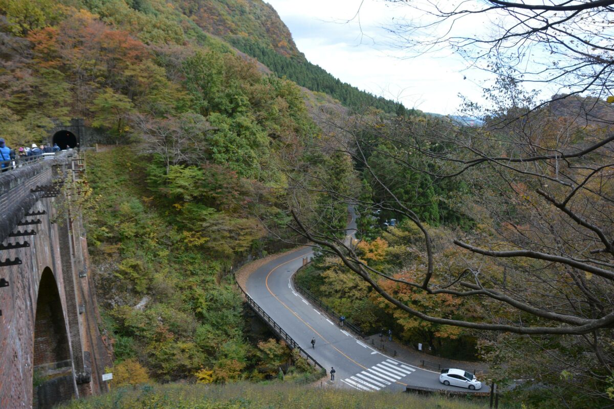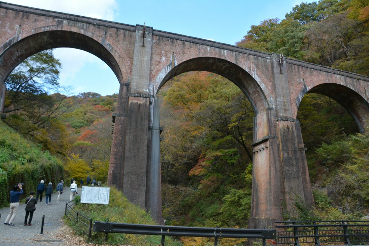 5号トンネルを抜けると「めがね橋」の東袂に出ます。「めがね橋」は「峠の湯」から約2.1キロです。日本最大級のレンガ造りによる4連のアーチ橋は、碓氷第三橋梁としてアプト式鉄道の運行を支えました。バランス感溢れる「めがね橋」は国の指定重要文化財に選ばれています。