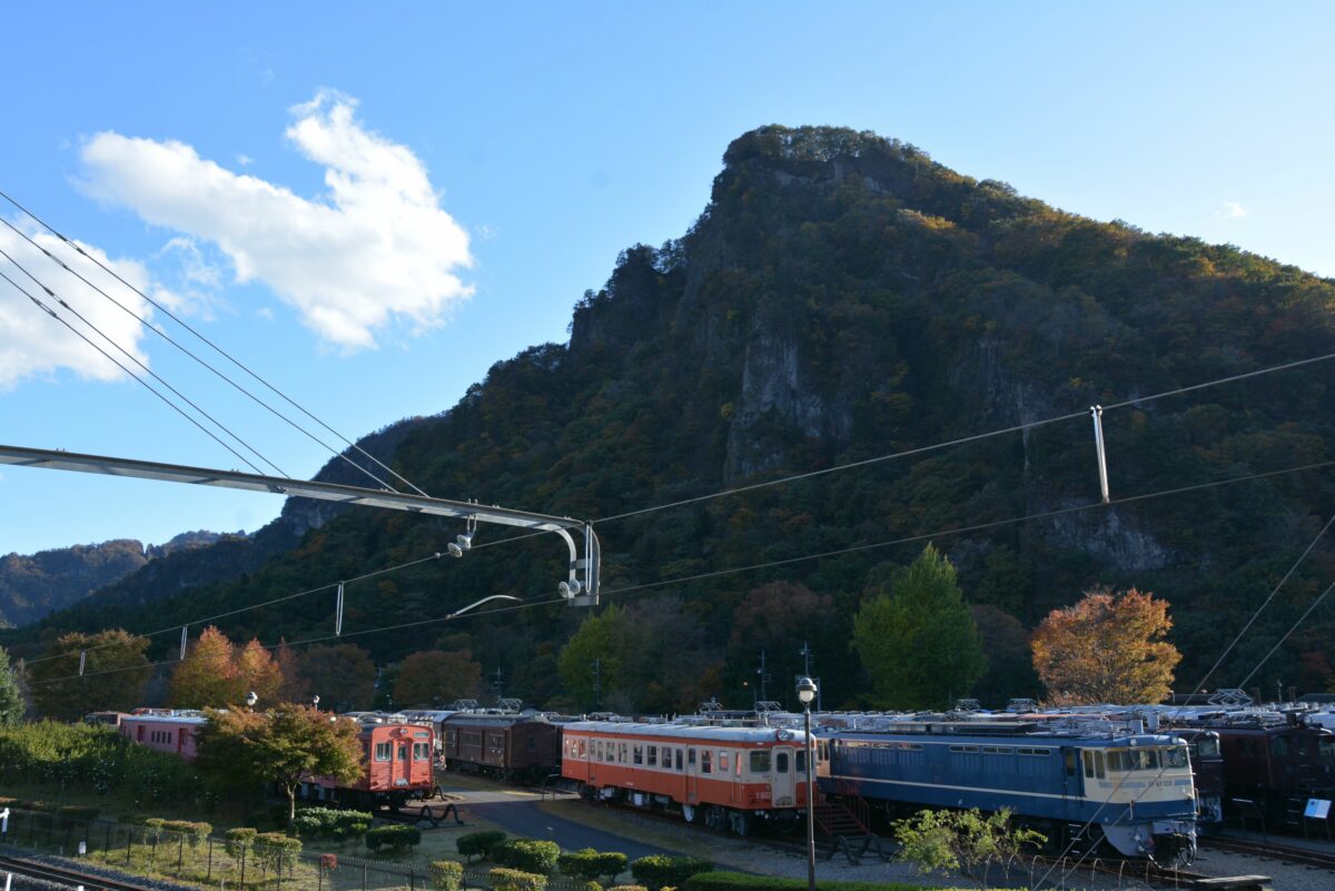 「鉄道文化むら」には日本の鉄道史を語り継ぐ電車の車両が展示されています。エリアの奥には1997年まで、碓氷峠を登っていた在来線特急の「あさま」の姿が碓氷峠の歴史を漂わせています。