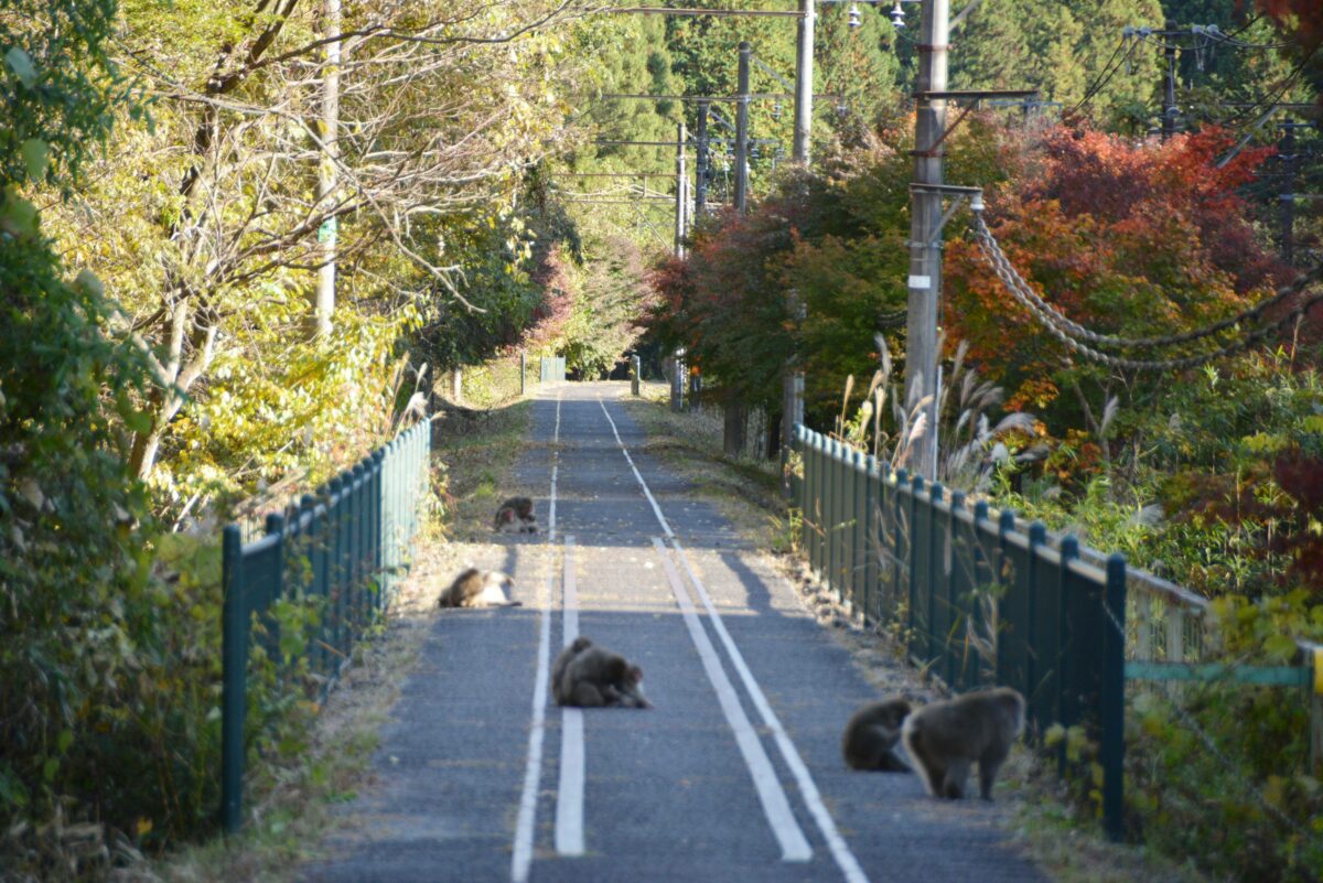 「アプトの道」で紅葉を鑑賞するサルの群れ