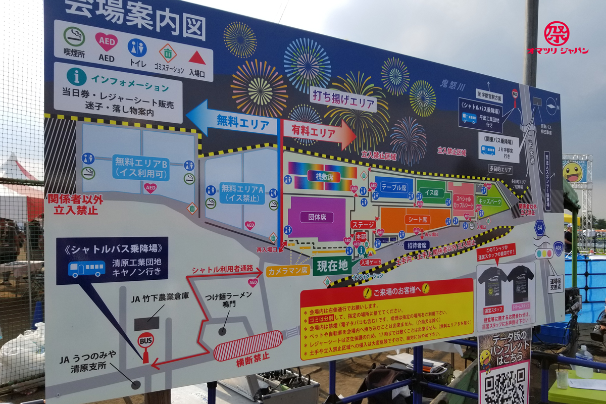 また、天候では宇都宮は雷が多い事でも有名で開催前には雷雨があり、会場が水浸しになるハプニングも!有料席のレジャーシートには巨大な水たまりができましたが、2018年の様な天候による急遽延期もなく、打ち上げ前には雨も止み無事に開催できて一安心でした。