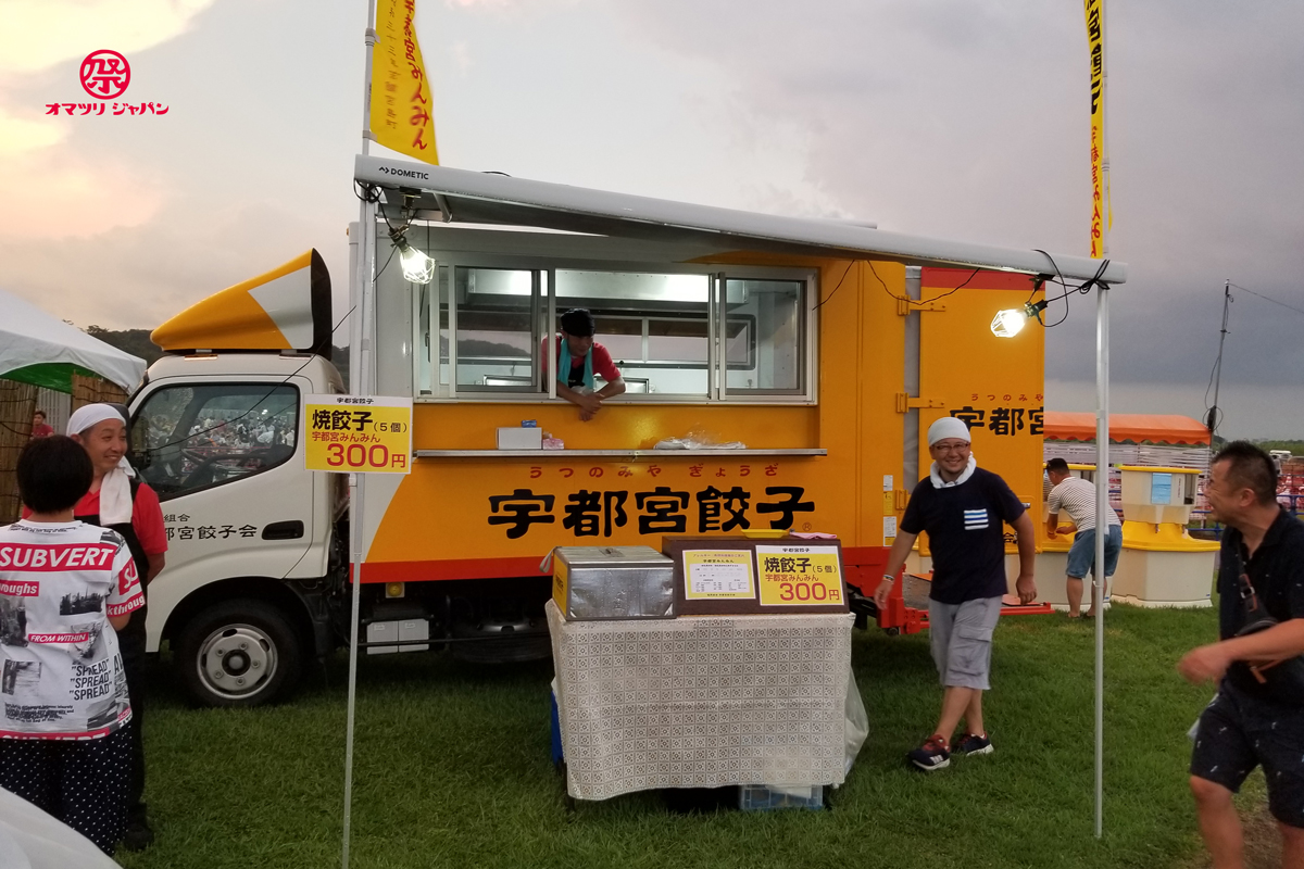 うつのみや花火大会でまず目に付くのが名物である餃子の投光器。一部有料席の屋台では、餃子の名店宇都宮みんみんなどからも出張しており、県外からの観客にとっては嬉しい心遣い。混雑した店舗に並ばなくても焼きたての餃子を花火会場内で食べられます。