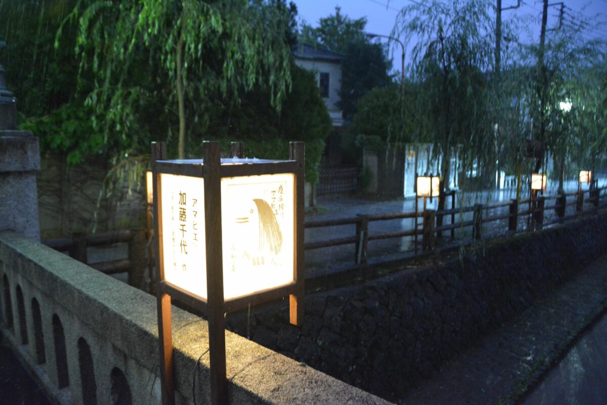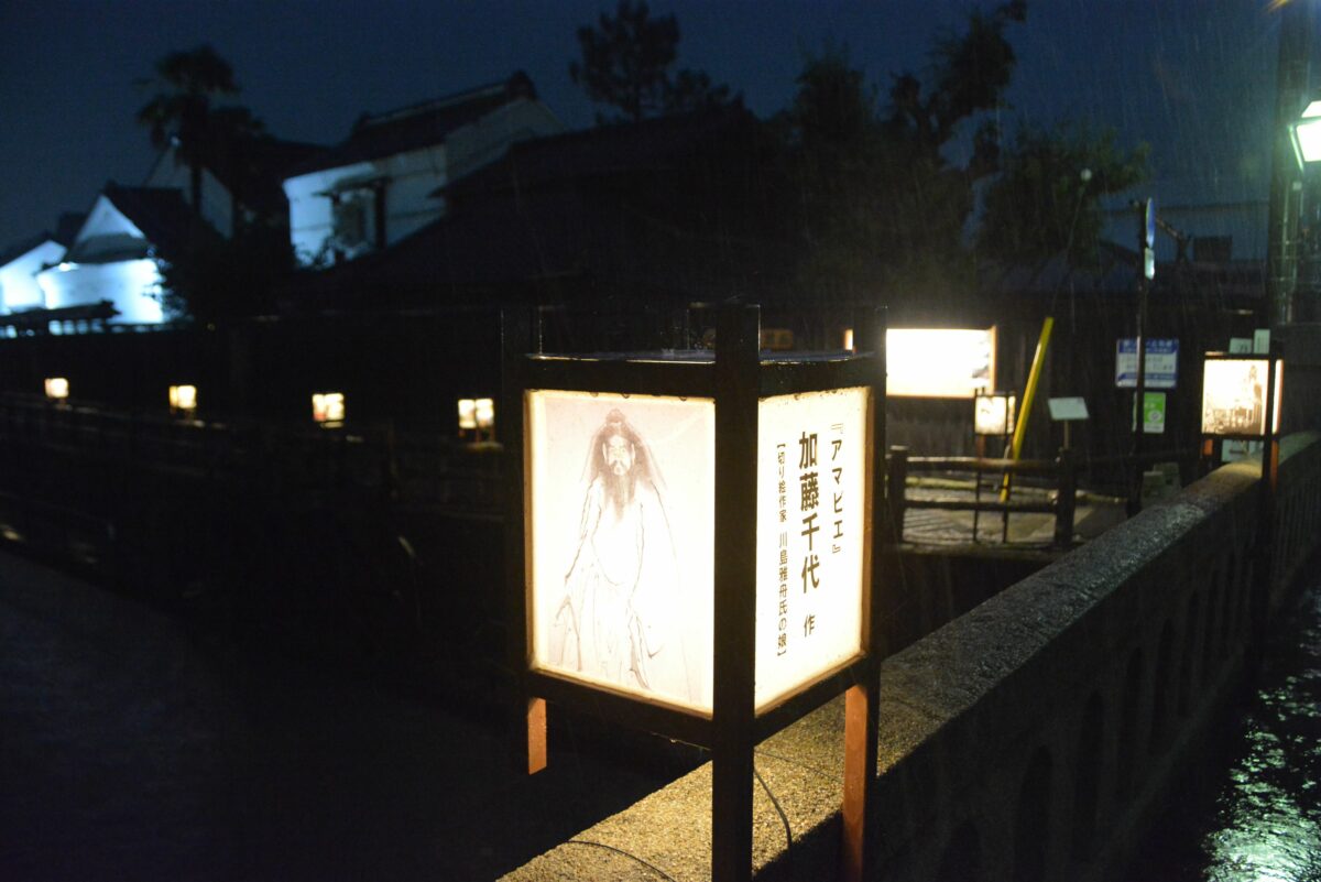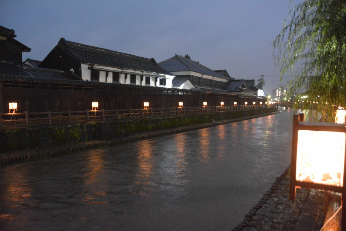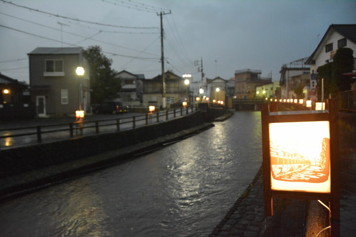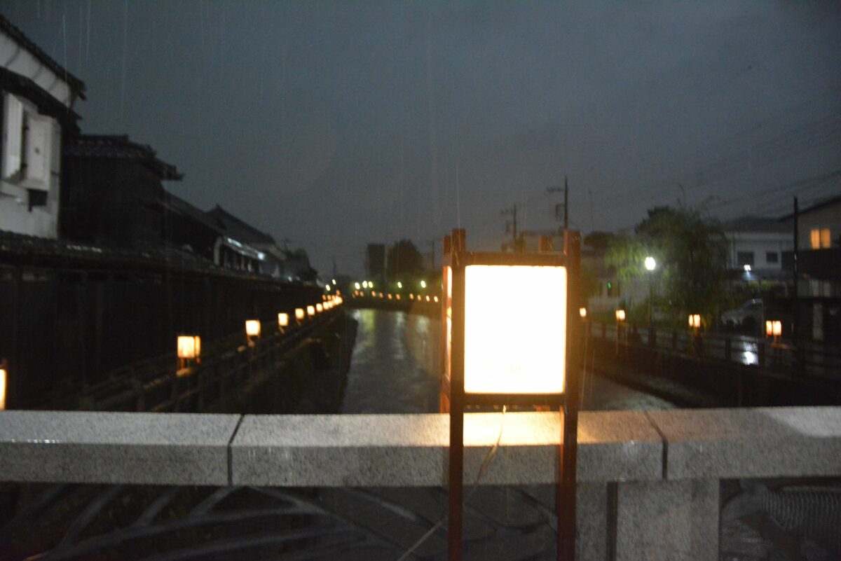 幸来橋の袂には蔵造りの建造物が繋がっているので、行灯の光で照らされると小江戸の情緒が漲ります。