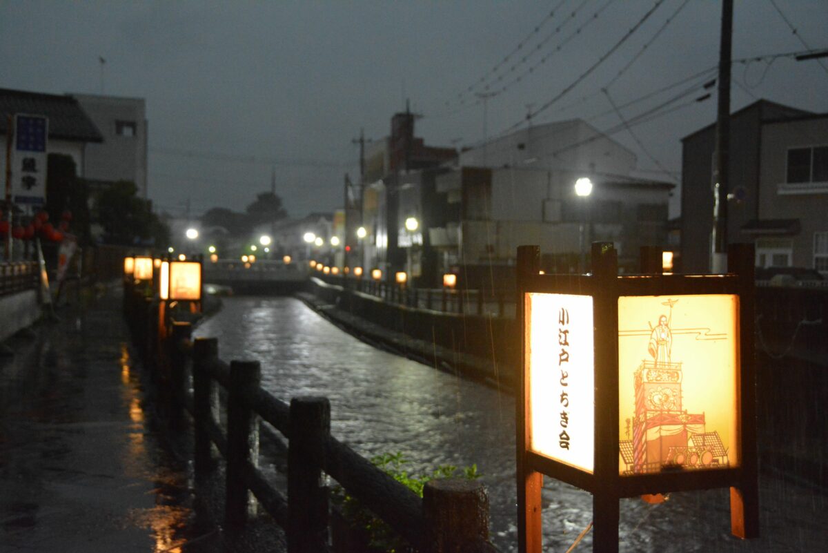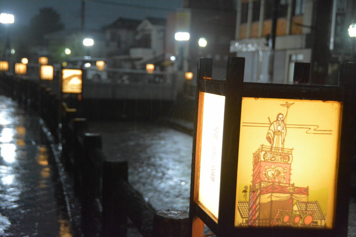うずま川に並ぶ行灯は19:00に灯が点されます。夕闇に、まつりの山車や蔵の街並みが、温かな光で浮かび上がるのです。