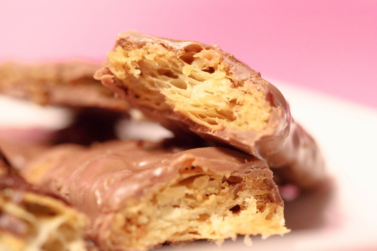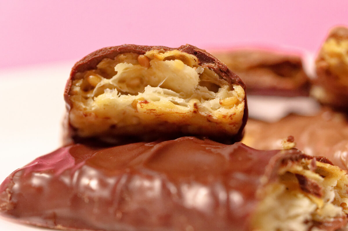 こちらはごまの断面。パイ生地にごまが練り込まれているのでがわかります。ごまの香ばしいフレーバと、ほろ苦いチョコレートの組み合わせが絶妙。きわどい味がクセになりそう😊