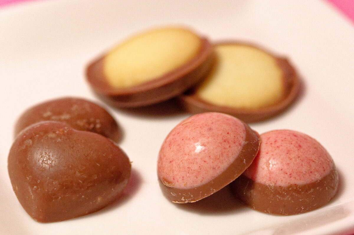 実食3品目は「アーモンドミルク」「ストロベリーミルク」「クッキーミルク」の3種類のチョコレート菓子が詰め合わせとなったプティショコラアソート。封を開けると個包装された一口サイズのチョコレートのお菓子が30個ほど入っています。
