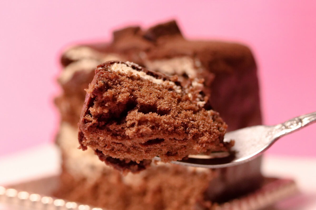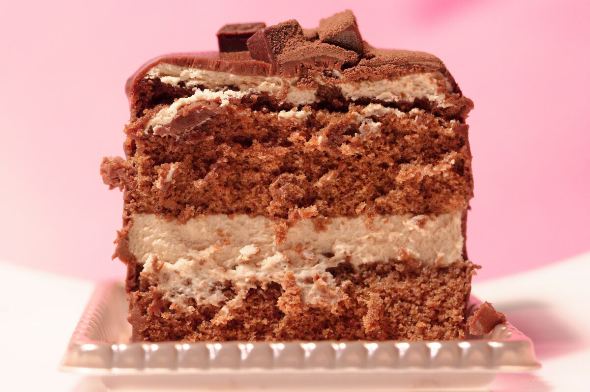 ケーキをカットしてみると、内部はクリームがサンドされたココアスポンジでできていました。