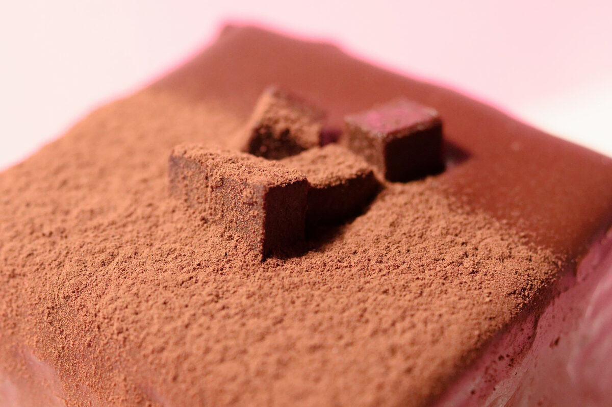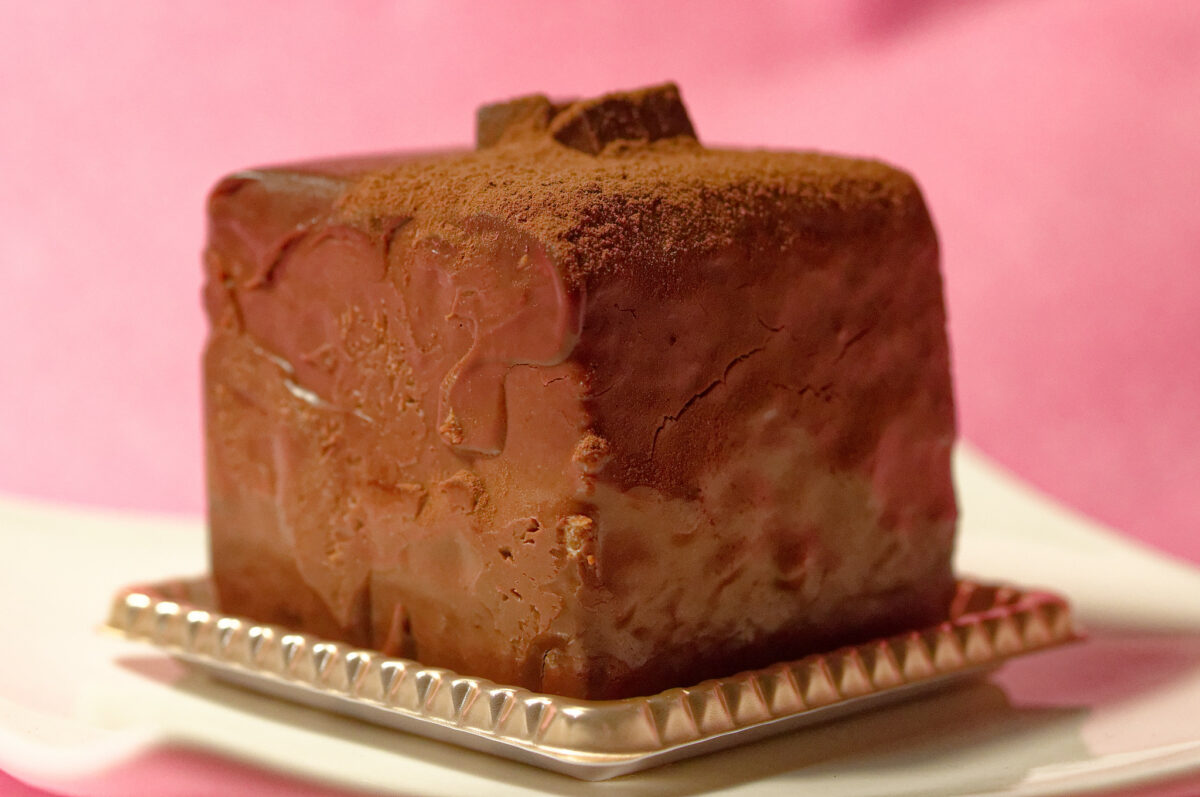 実食1品目はガトーショコラ。カリカリとした食感がアクセントのキューブ状のチョコレートと、薫り立つココアパウダーが見た目も楽しませてくれます。